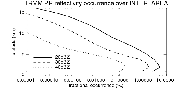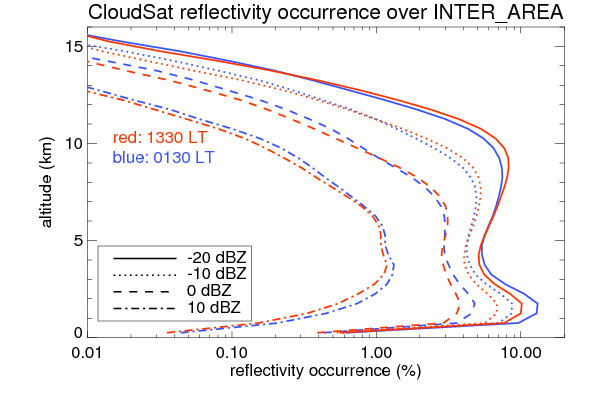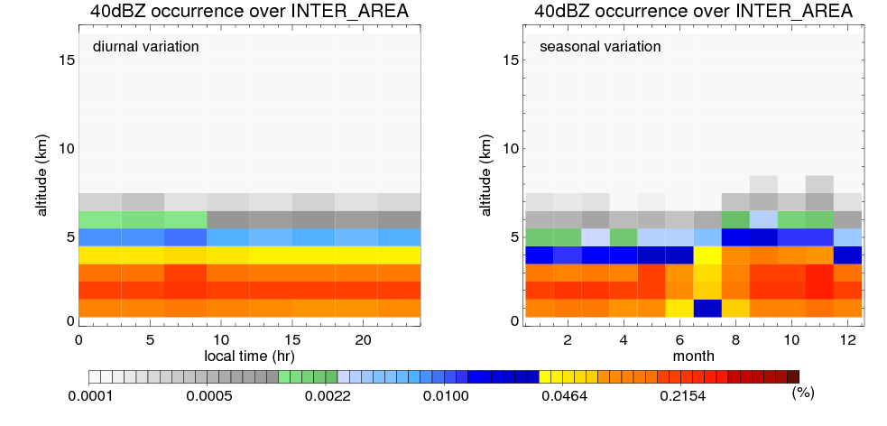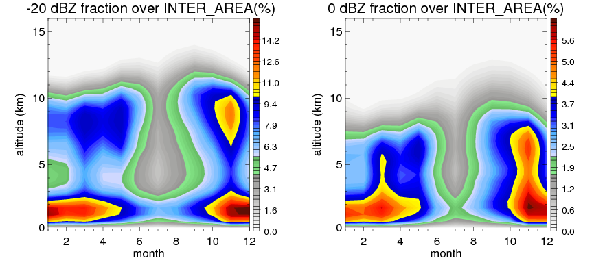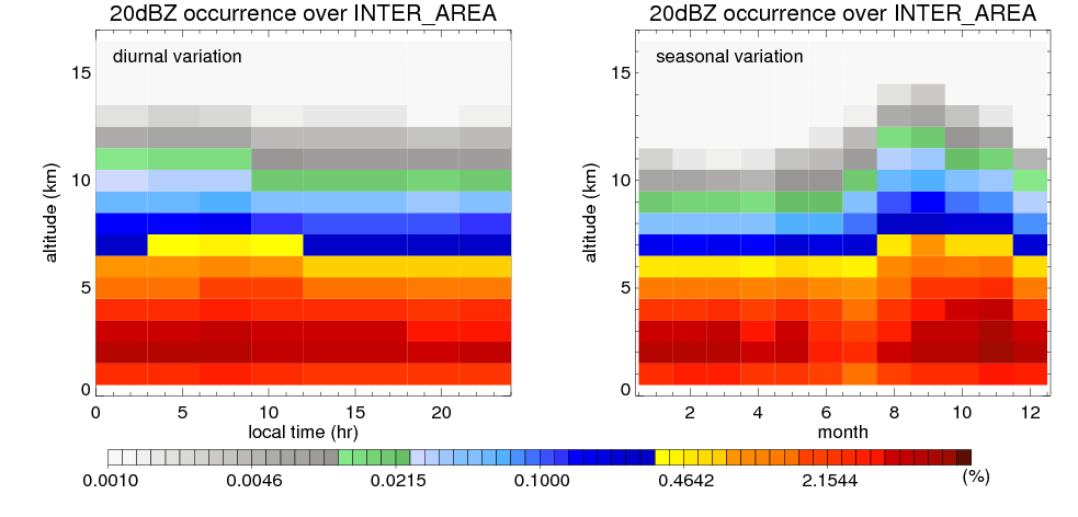 Here the precipitation means the precipitable hydrometeors (raindrops, snow flakes, graupel and hails) that detected by TRMM precipitation radar. Following figure shows the vertical profiles of 20, 30 and 40 dBZ fractional occurrence over INTER_AREA in different seasons. The seasonal and diurnal variations of precipitation (20 dBZ) fractional occurrence at different altitudes are shown below: The seasonal and diurnal variations of INTENSIVE precipitation (40 dBZ) fractional occurrence at different altitudes are shown below: Clouds are consisted of small hydrometeors that undetectable by TRMM precipitation radar (Ku band). CloudSat (W band radar) provides the much great details of clouds. Following figure shows the vertical structure of the thin and thick clouds over INTER_AREA. Note that high reflectivity at low levels are less frequent due to the attenuation. The seasonal variation of thin (-20 dBZ) and thick (0 dBZ) cloud over INTER_AREA are shown below: |