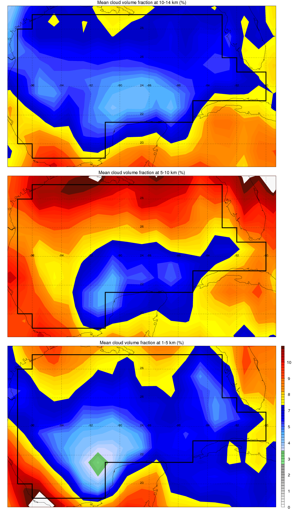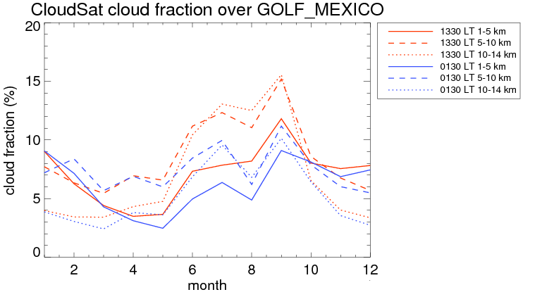 Over GOLF_MEXICO , mean high level (10-14 km) cloud volume fraction is about 6.6%. Mean mid level (5-10 km) cloud volume fraction is about 8.3%. Mean low level (1-5 km) cloud volume fraction is about 6.8%. Seasonal and day vs. night variations of high, mid and low level cloud fraction over GOLF_MEXICO are shown in following figure. You may check the details of cloud fraction in various seasons and at different local times. |