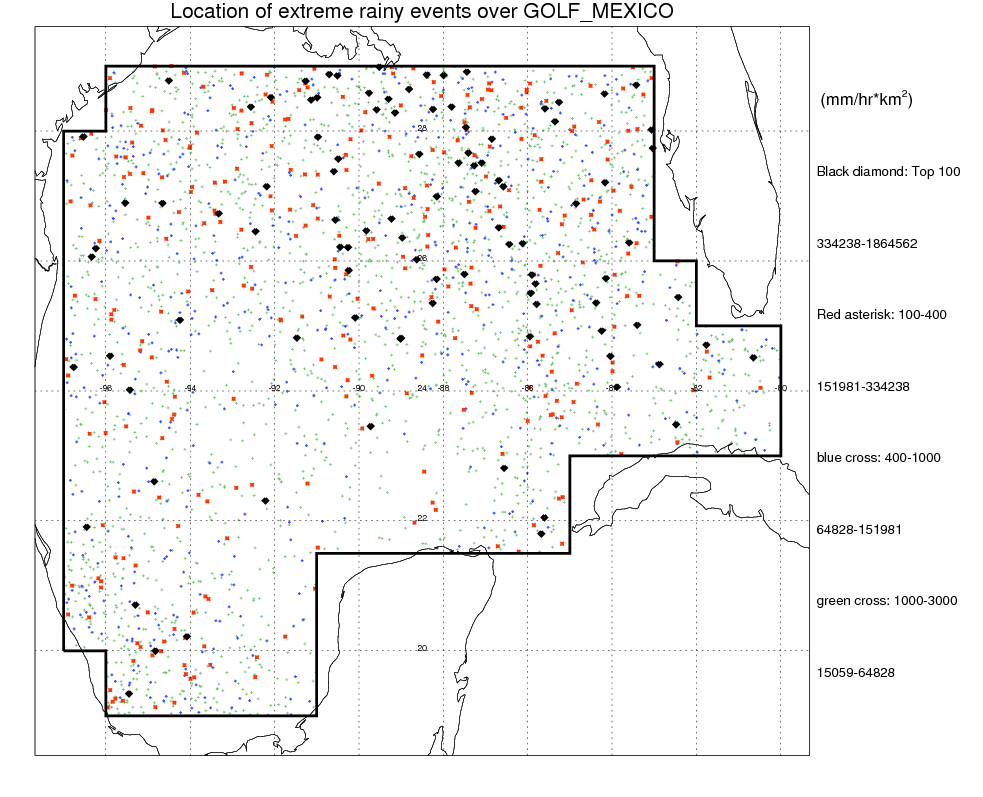 Following figure shows the location of the precipitation feautres categorized by the volumetric rainfall.