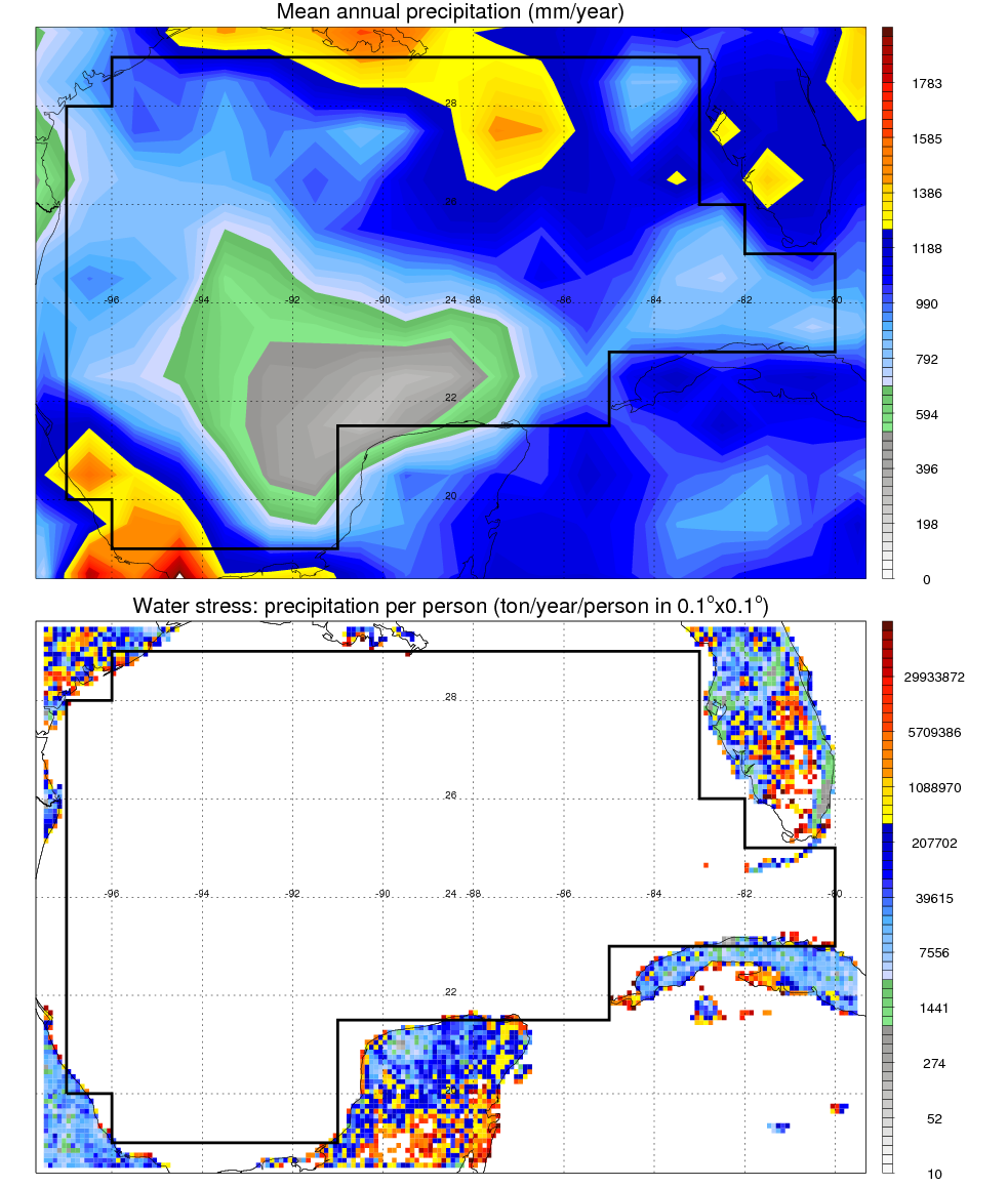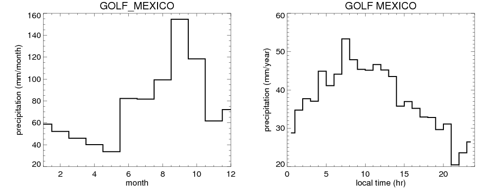 Over GOLF_MEXICO , mean annual precipitation are estimated with 900.8 (mm/year) from precipitation radar, and 801.4 (mm/year) from microwave radiometer observations. (see high resolution precipitation product , NOTE: it may take long time to generate for large area) In total, thunderstorms (systems with detected lightning flashes) contribute 51 %, MCSs (Mesoscale convective systems with raining area > 2000 km^2) contribute 71 % of all precipitation. Seasonal and diurnal variations of rainfall over GOLF_MEXICO are shown in following figure. You may check the details of rainfall contributions from precipitation systems with different sizes and intensities in various seasons and at different local times. |