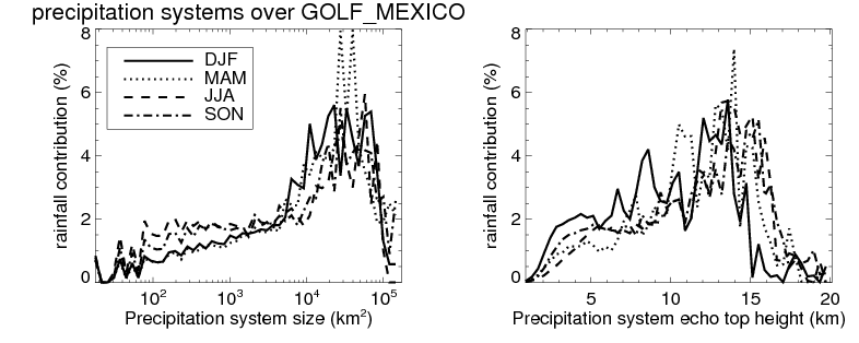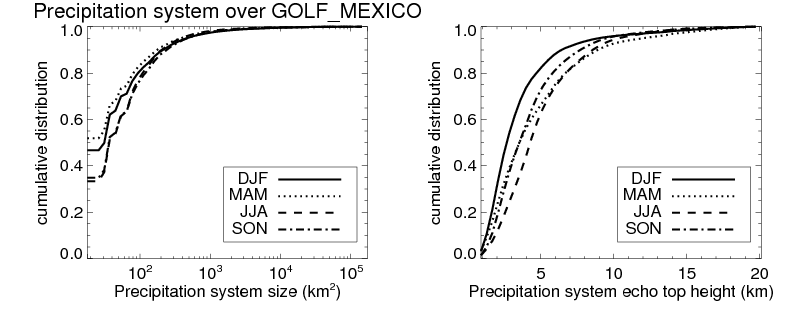 Over GOLF_MEXICO , mean size of precipitation system about 250.7 (km^2) and mean maximum radar echo top height of these precipitation systems is about 4.7 km. Following figure shows the cumulative distribution of the sizes and depths of the precipitation systems in different seasons: Though usually there are more small systems, the larger systems would bring more total precipitation. |