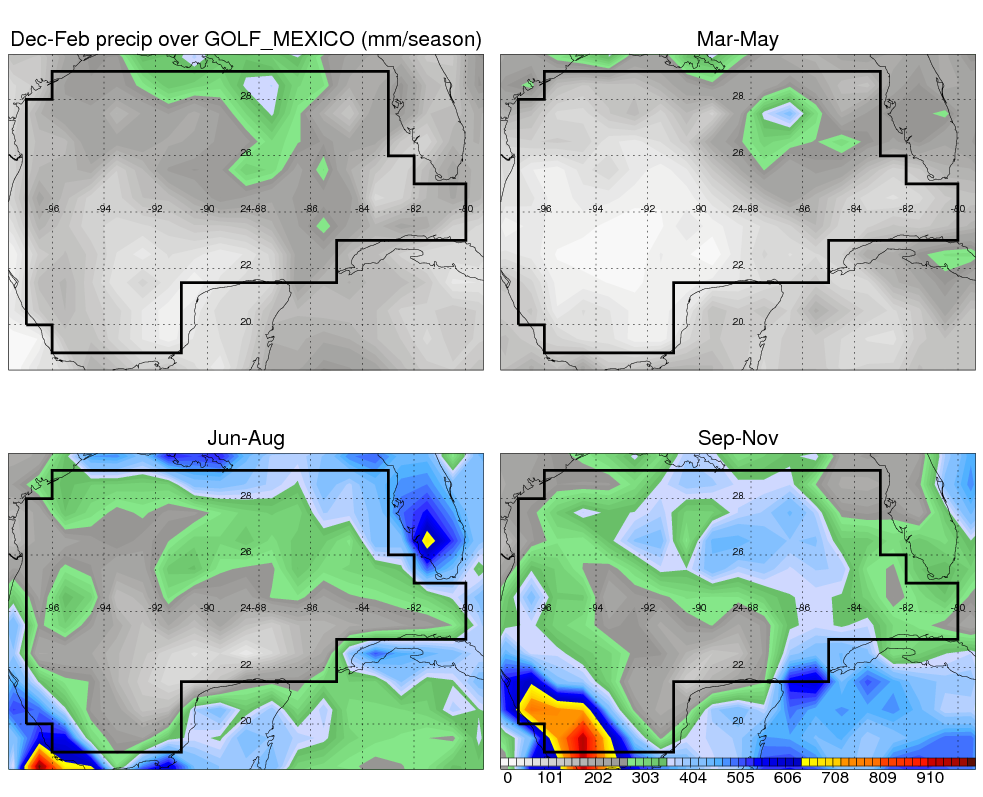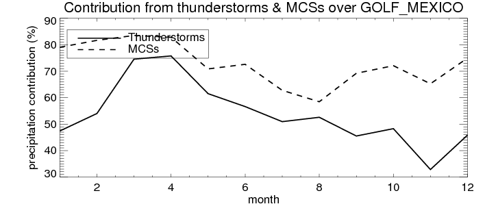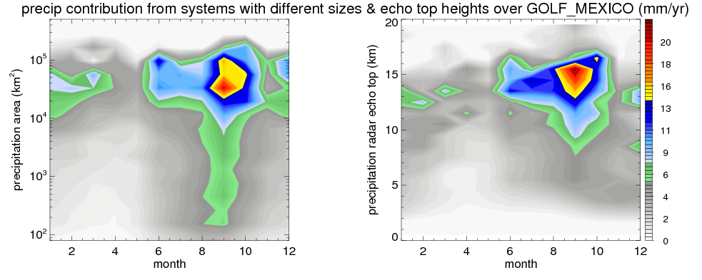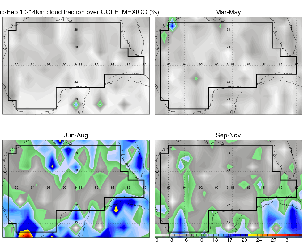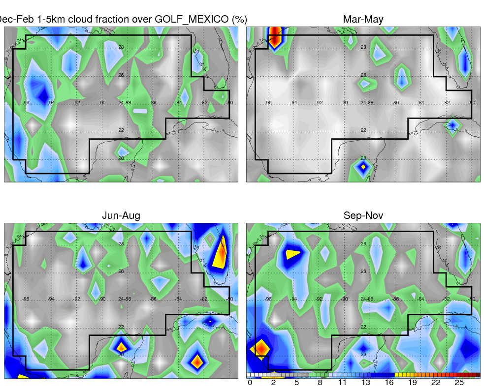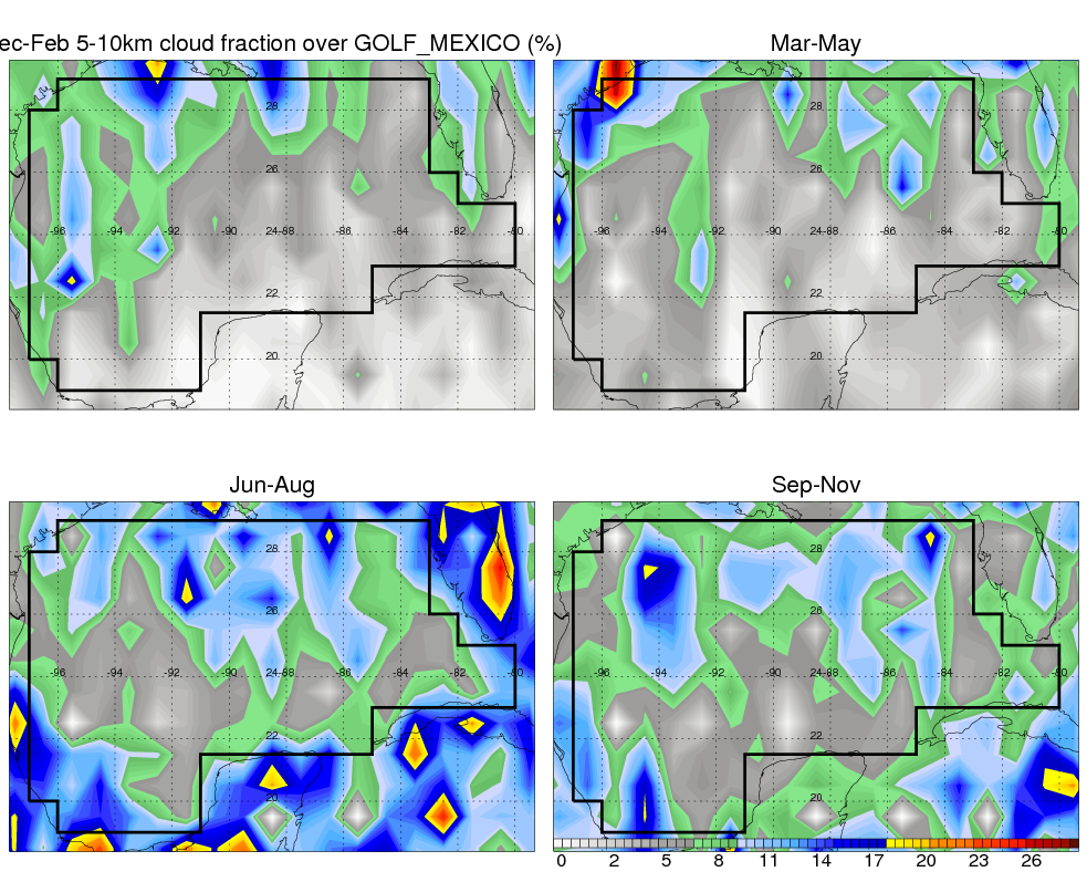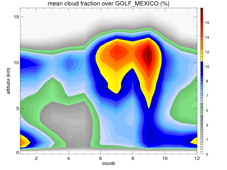 Over GOLF_MEXICO , mean annual precipitation are estimated with 900.8 (mm/year) from TRMM precipitation radar. (distribution of precipitation see here ) Total surface rainfall is brought by various precipitation systems. The seasonal variation of precipitation from systems with different sizes and heights are shown below: In total, thunderstorms (systems with detected lightning flashes) contribute 51 %, MCSs (Mesoscale convective systems with raining area > 2000 km^2) contribute 71 % of all precipitation. Seasonal variations of fraction of precipitation from thunderstorms and MCSs are shown below: The seasonal variation of geographical distribution of CloudSat cloud fraction over GOLF_MEXICO is shown below: The seasonal variation of mean CloudSat level cloud fraction at different altitudes over GOLF_MEXICO is shown below: |