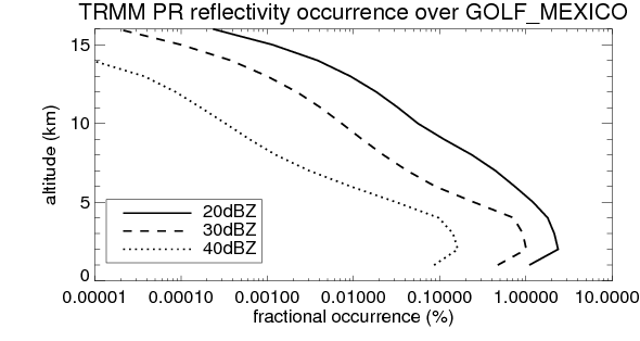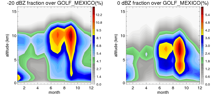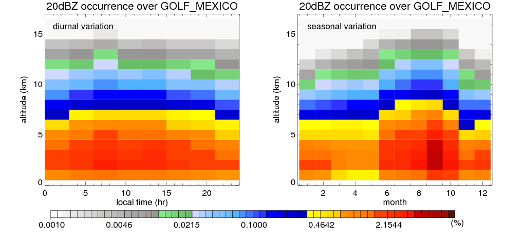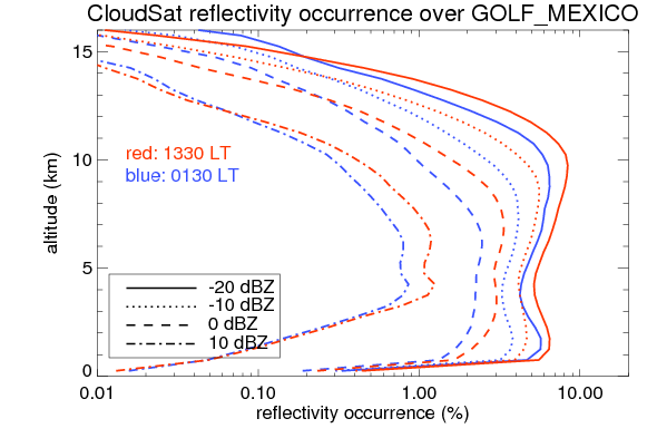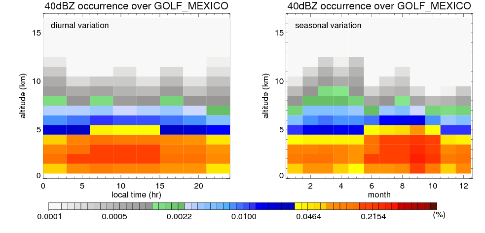 Here the precipitation means the precipitable hydrometeors (raindrops, snow flakes, graupel and hails) that detected by TRMM precipitation radar. Following figure shows the vertical profiles of 20, 30 and 40 dBZ fractional occurrence over GOLF_MEXICO in different seasons. The seasonal and diurnal variations of precipitation (20 dBZ) fractional occurrence at different altitudes are shown below: The seasonal and diurnal variations of INTENSIVE precipitation (40 dBZ) fractional occurrence at different altitudes are shown below: Clouds are consisted of small hydrometeors that undetectable by TRMM precipitation radar (Ku band). CloudSat (W band radar) provides the much great details of clouds. Following figure shows the vertical structure of the thin and thick clouds over GOLF_MEXICO. Note that high reflectivity at low levels are less frequent due to the attenuation. The seasonal variation of thin (-20 dBZ) and thick (0 dBZ) cloud over GOLF_MEXICO are shown below: |