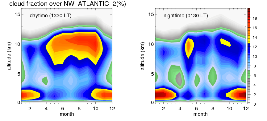 Many studies suggested that the diurnal variation of the precipitation is related to the life cycles of the precipitation systems, which is frequently driven by the surface sensible heating. Over NW_ATLANTIC_2, mean annual precipitation are estimated with 1190.0 (mm/year) from precipitation radar. Detailed diurnal variation of the precipitation at high resolution can be accessed here (NOTE: it may take long time to generate for a large area). The diurnal variation of precipitation from systems with different sizes and heights are shown below: In total, thunderstorms (systems with detected lightning flashes) contribute 36 %, MCSs (Mesoscale convective systems with raining area > 2000 km^2) contribute 72 % of all precipitation over NW_ATLANTIC_2. Diurnal variations of fraction of precipitation from thunderstorms and MCSs over NW_ATLANTIC_2 are shown below: Certainly there is a strong diurnal variation of different types of clouds. Because CloudSat observes at 0130 and 1330 local time, here the daytime and night cloud fraction in different seasons are presented: |