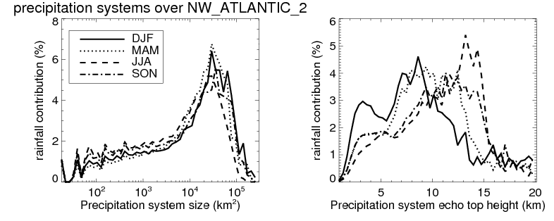 Over NW_ATLANTIC_2 , mean size of precipitation system about 248.9 (km^2) and mean maximum radar echo top height of these precipitation systems is about 3.9 km. Following figure shows the cumulative distribution of the sizes and depths of the precipitation systems in different seasons: Though usually there are more small systems, the larger systems would bring more total precipitation. |