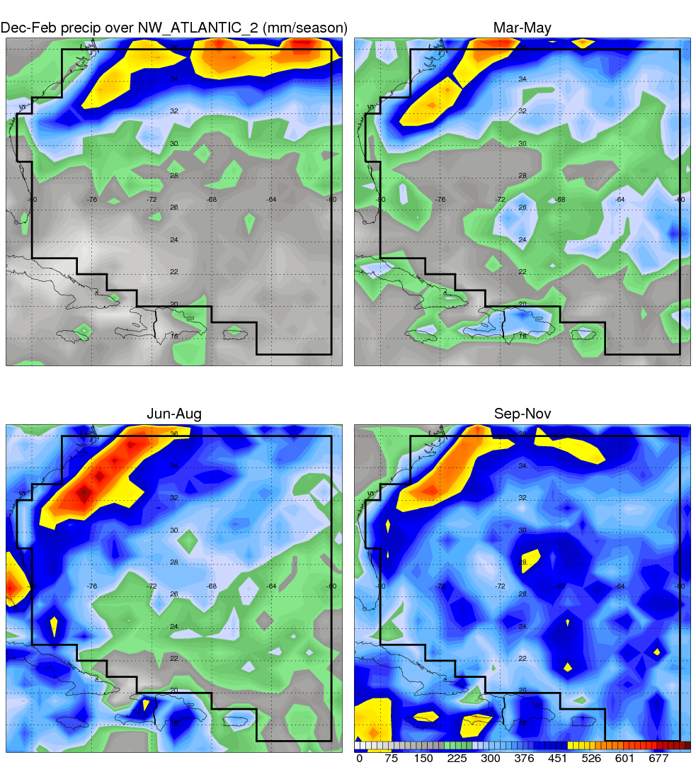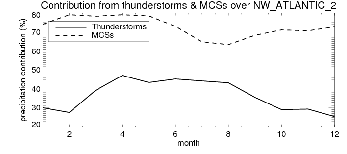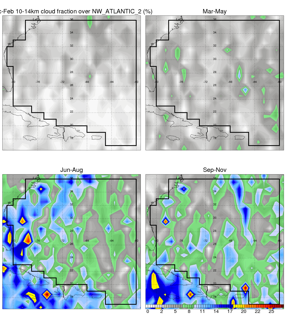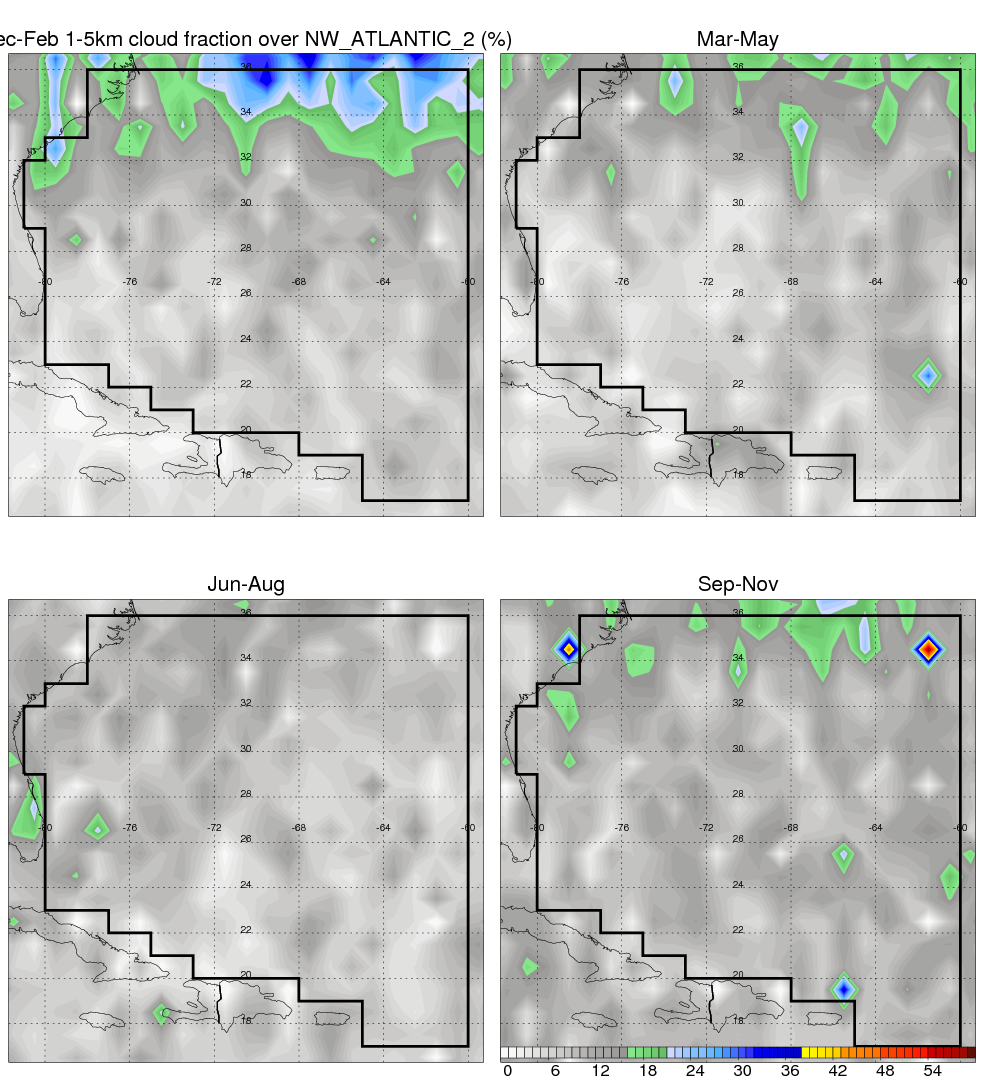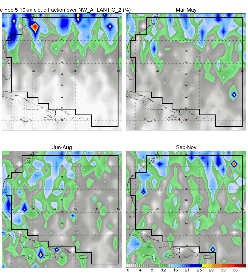 Over NW_ATLANTIC_2 , mean annual precipitation are estimated with 1190.0 (mm/year) from TRMM precipitation radar. (distribution of precipitation see here ) Total surface rainfall is brought by various precipitation systems. The seasonal variation of precipitation from systems with different sizes and heights are shown below: In total, thunderstorms (systems with detected lightning flashes) contribute 36 %, MCSs (Mesoscale convective systems with raining area > 2000 km^2) contribute 72 % of all precipitation. Seasonal variations of fraction of precipitation from thunderstorms and MCSs are shown below: The seasonal variation of geographical distribution of CloudSat cloud fraction over NW_ATLANTIC_2 is shown below: The seasonal variation of mean CloudSat level cloud fraction at different altitudes over NW_ATLANTIC_2 is shown below: |