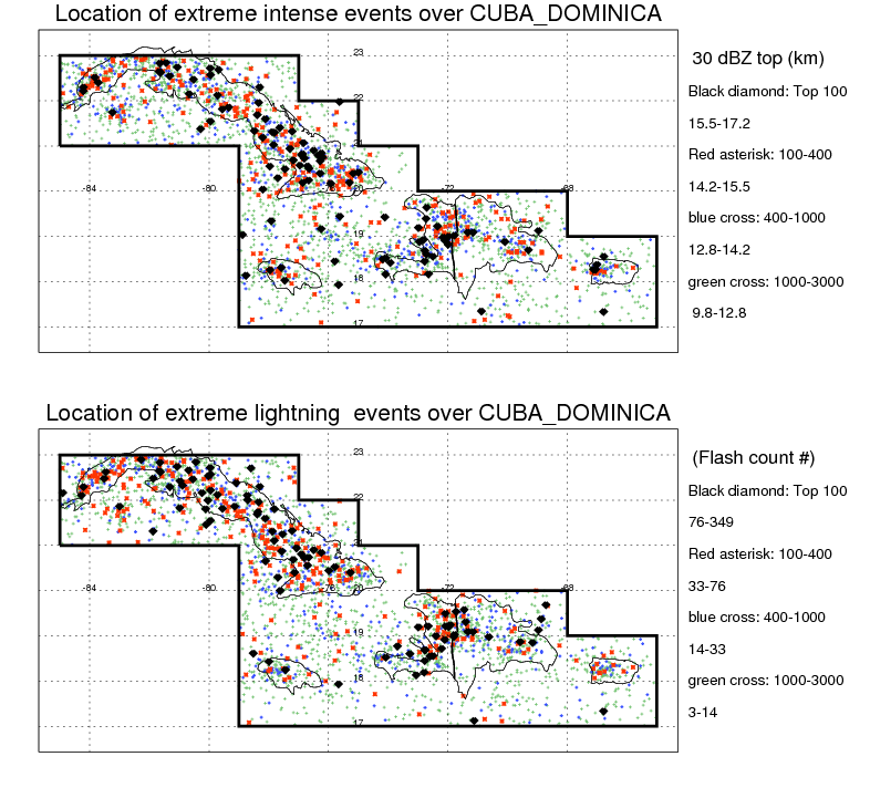 Following figure shows the location of the precipitation feautres categorized by the lightning rate and 30 dBZ echo top.
