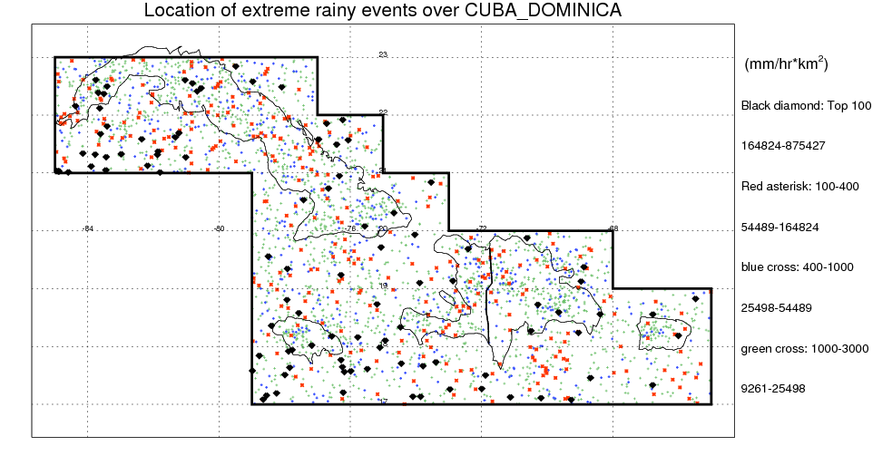 Following figure shows the location of the precipitation feautres categorized by the volumetric rainfall.