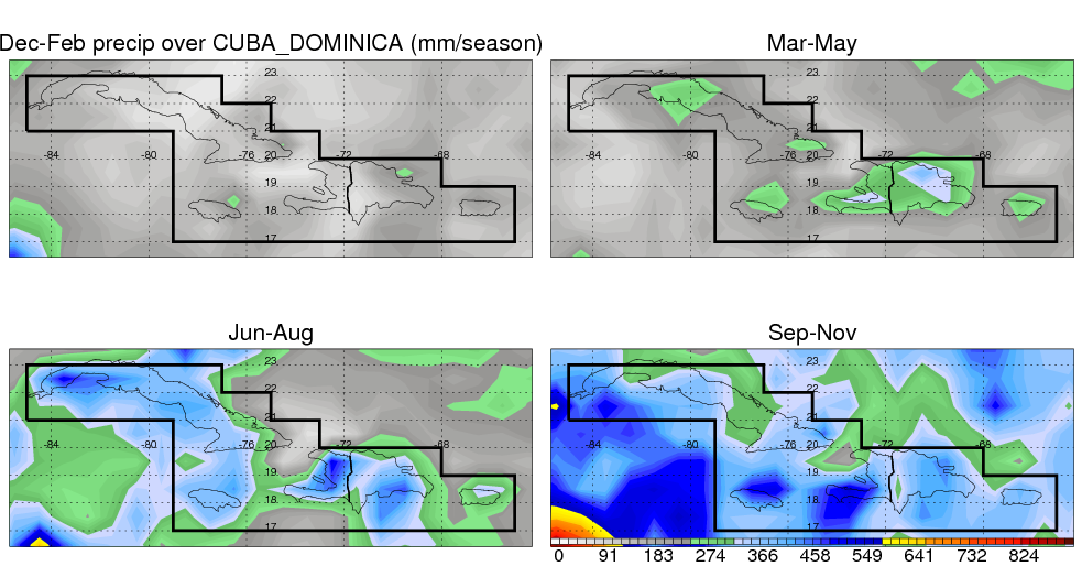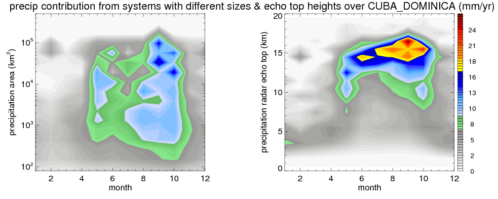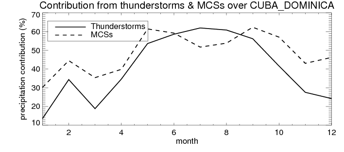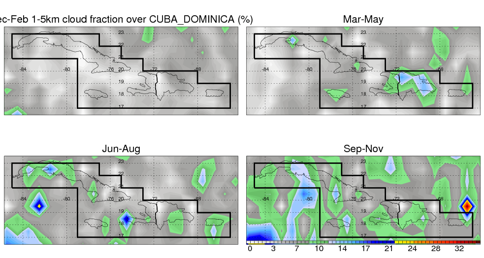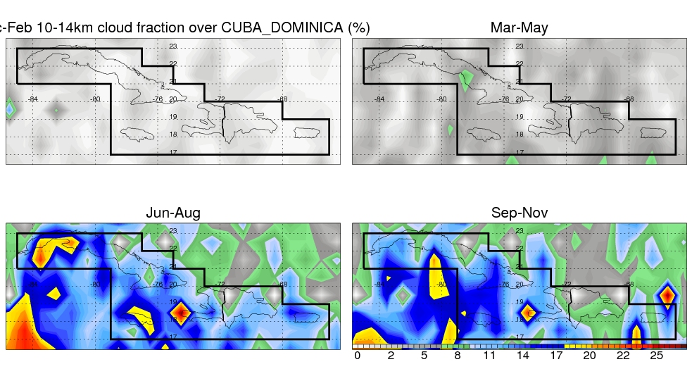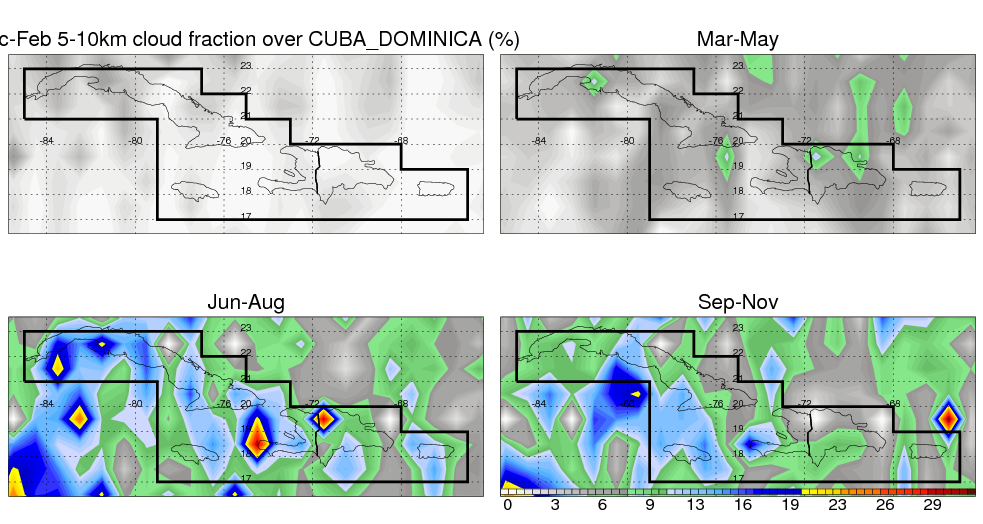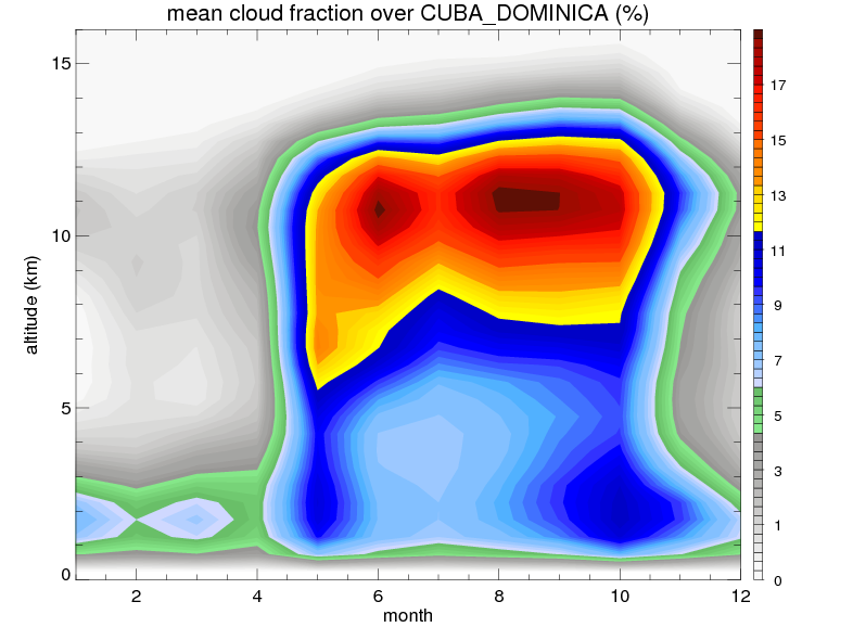 Over CUBA_DOMINICA , mean annual precipitation are estimated with 1072.5 (mm/year) from TRMM precipitation radar. (distribution of precipitation see here ) Total surface rainfall is brought by various precipitation systems. The seasonal variation of precipitation from systems with different sizes and heights are shown below: In total, thunderstorms (systems with detected lightning flashes) contribute 46 %, MCSs (Mesoscale convective systems with raining area > 2000 km^2) contribute 53 % of all precipitation. Seasonal variations of fraction of precipitation from thunderstorms and MCSs are shown below: The seasonal variation of geographical distribution of CloudSat cloud fraction over CUBA_DOMINICA is shown below: The seasonal variation of mean CloudSat level cloud fraction at different altitudes over CUBA_DOMINICA is shown below: |