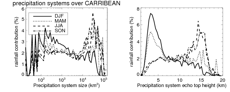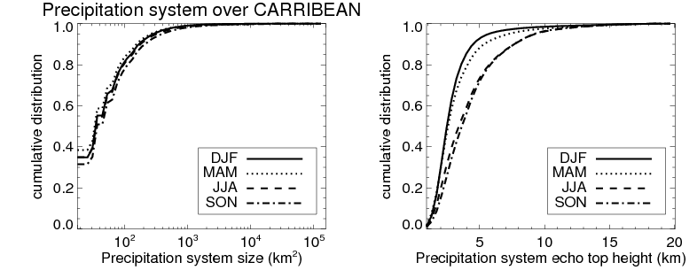 Over CARRIBEAN , mean size of precipitation system about 167.4 (km^2) and mean maximum radar echo top height of these precipitation systems is about 4.1 km. Following figure shows the cumulative distribution of the sizes and depths of the precipitation systems in different seasons: Though usually there are more small systems, the larger systems would bring more total precipitation. |
