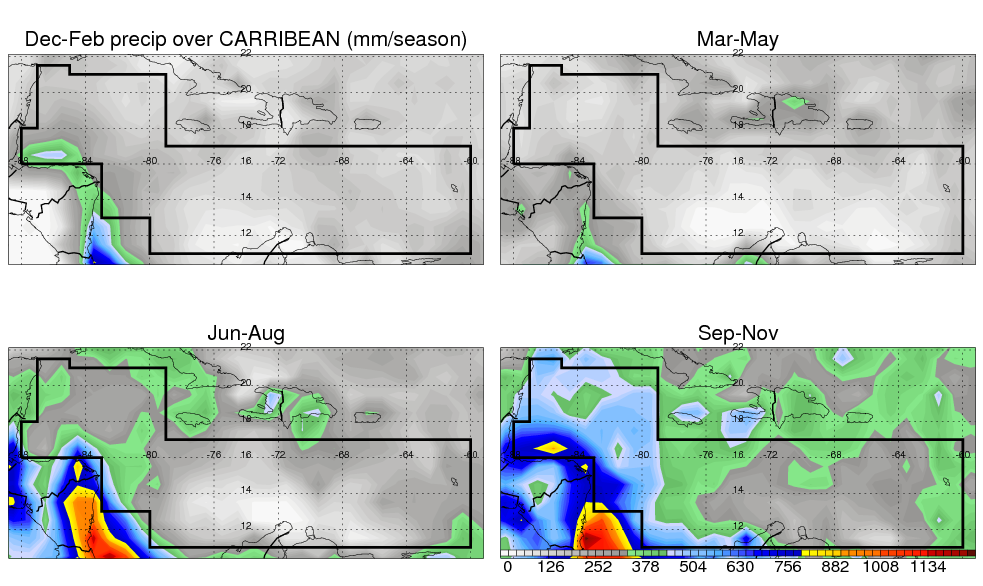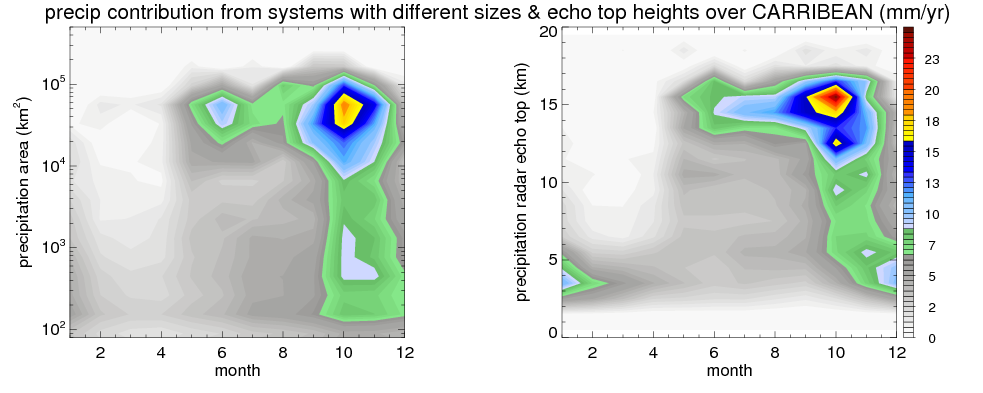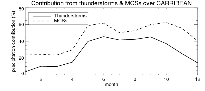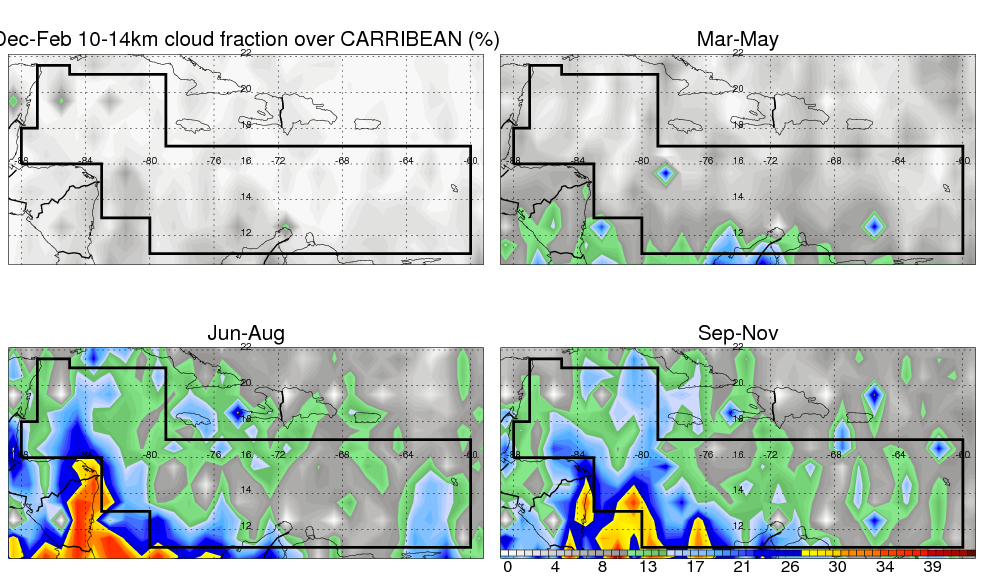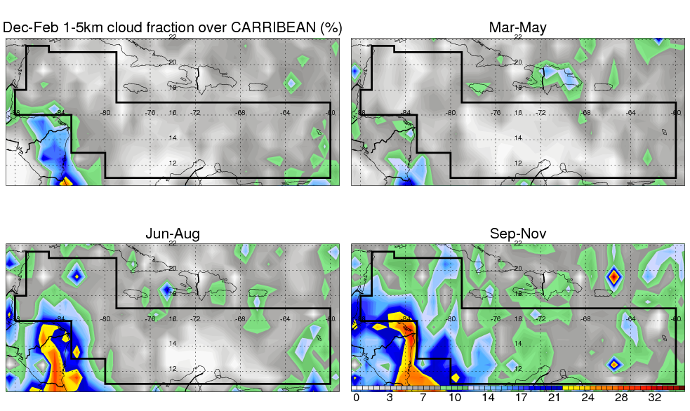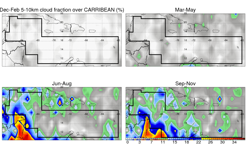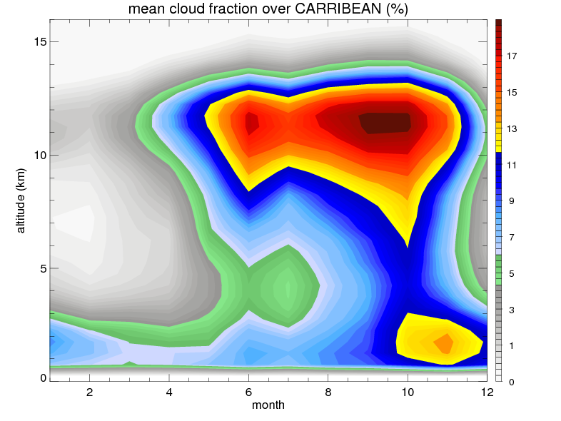 Over CARRIBEAN , mean annual precipitation are estimated with 917.9 (mm/year) from TRMM precipitation radar. (distribution of precipitation see here ) Total surface rainfall is brought by various precipitation systems. The seasonal variation of precipitation from systems with different sizes and heights are shown below: In total, thunderstorms (systems with detected lightning flashes) contribute 32 %, MCSs (Mesoscale convective systems with raining area > 2000 km^2) contribute 52 % of all precipitation. Seasonal variations of fraction of precipitation from thunderstorms and MCSs are shown below: The seasonal variation of geographical distribution of CloudSat cloud fraction over CARRIBEAN is shown below: The seasonal variation of mean CloudSat level cloud fraction at different altitudes over CARRIBEAN is shown below: |