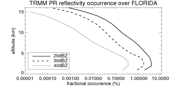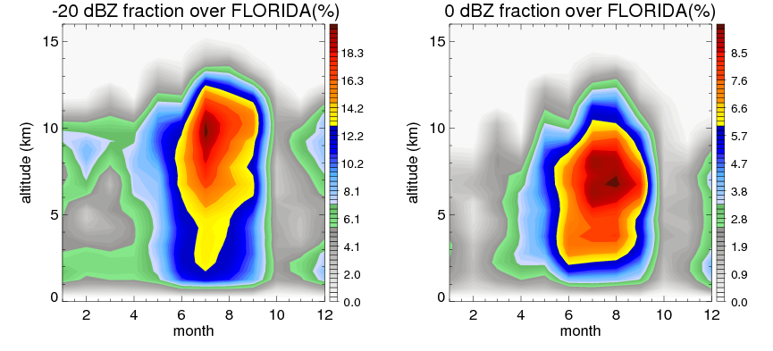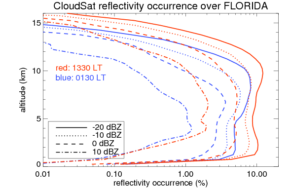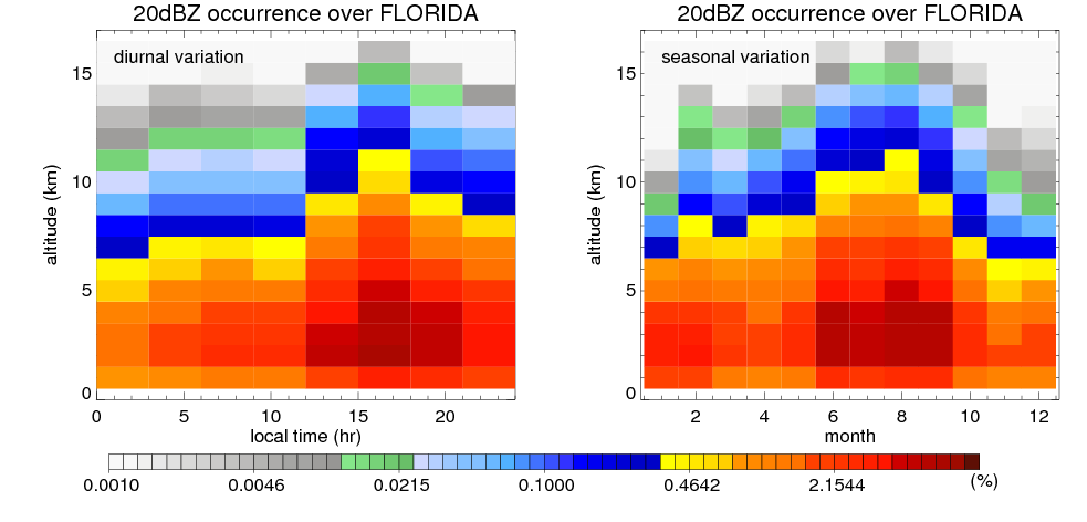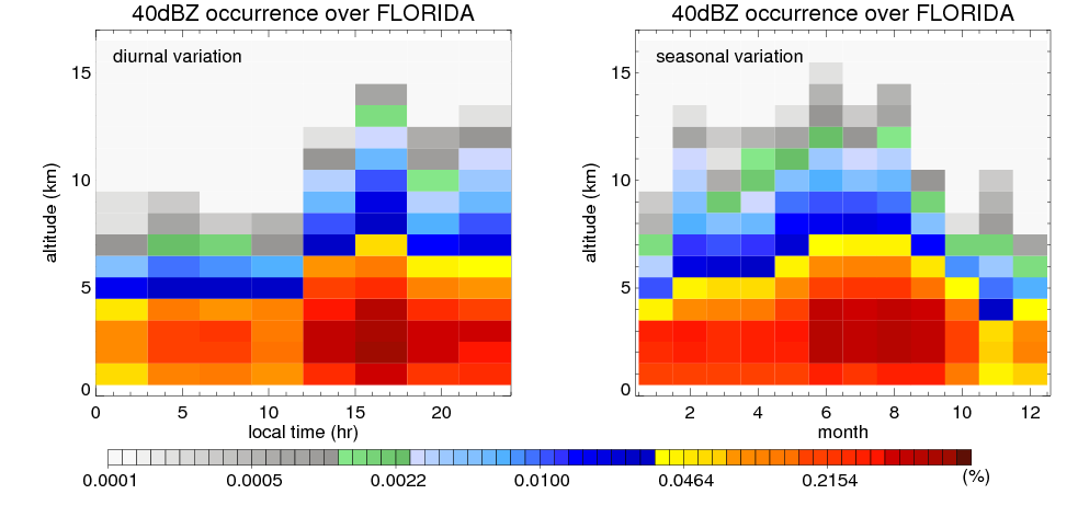 Here the precipitation means the precipitable hydrometeors (raindrops, snow flakes, graupel and hails) that detected by TRMM precipitation radar. Following figure shows the vertical profiles of 20, 30 and 40 dBZ fractional occurrence over FLORIDA in different seasons. The seasonal and diurnal variations of precipitation (20 dBZ) fractional occurrence at different altitudes are shown below: The seasonal and diurnal variations of INTENSIVE precipitation (40 dBZ) fractional occurrence at different altitudes are shown below: Clouds are consisted of small hydrometeors that undetectable by TRMM precipitation radar (Ku band). CloudSat (W band radar) provides the much great details of clouds. Following figure shows the vertical structure of the thin and thick clouds over FLORIDA. Note that high reflectivity at low levels are less frequent due to the attenuation. The seasonal variation of thin (-20 dBZ) and thick (0 dBZ) cloud over FLORIDA are shown below: |