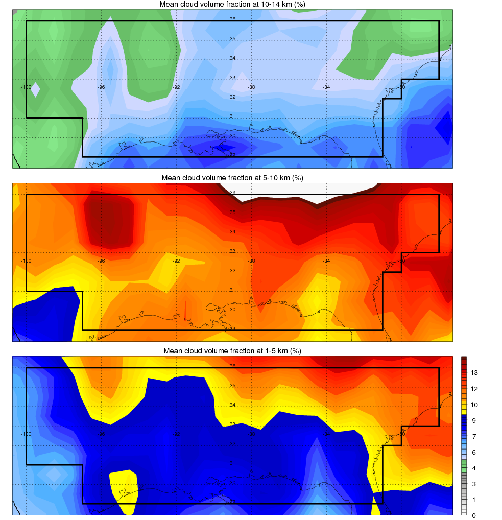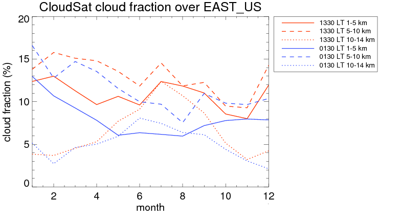 Over EAST_US , mean high level (10-14 km) cloud volume fraction is about 6.1%. Mean mid level (5-10 km) cloud volume fraction is about 12.3%. Mean low level (1-5 km) cloud volume fraction is about 9.7%. Seasonal and day vs. night variations of high, mid and low level cloud fraction over EAST_US are shown in following figure. You may check the details of cloud fraction in various seasons and at different local times. |