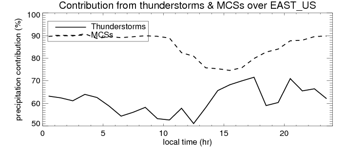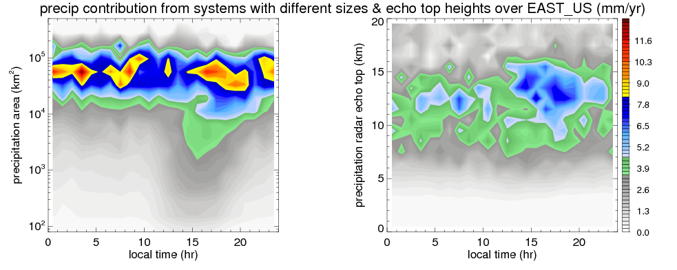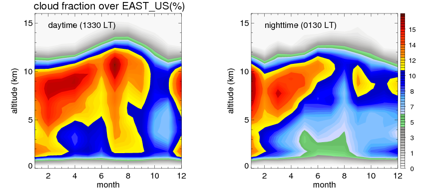 Many studies suggested that the diurnal variation of the precipitation is related to the life cycles of the precipitation systems, which is frequently driven by the surface sensible heating. Over EAST_US, mean annual precipitation are estimated with 1159.8 (mm/year) from precipitation radar. Detailed diurnal variation of the precipitation at high resolution can be accessed here (NOTE: it may take long time to generate for a large area). The diurnal variation of precipitation from systems with different sizes and heights are shown below: In total, thunderstorms (systems with detected lightning flashes) contribute 61 %, MCSs (Mesoscale convective systems with raining area > 2000 km^2) contribute 85 % of all precipitation over EAST_US. Diurnal variations of fraction of precipitation from thunderstorms and MCSs over EAST_US are shown below: Certainly there is a strong diurnal variation of different types of clouds. Because CloudSat observes at 0130 and 1330 local time, here the daytime and night cloud fraction in different seasons are presented: |