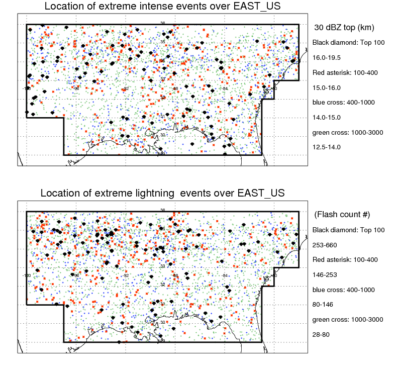 Following figure shows the location of the precipitation feautres categorized by the lightning rate and 30 dBZ echo top.