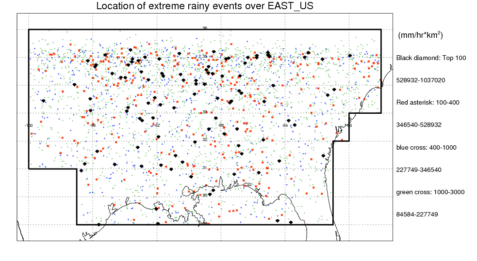 Following figure shows the location of the precipitation feautres categorized by the volumetric rainfall.