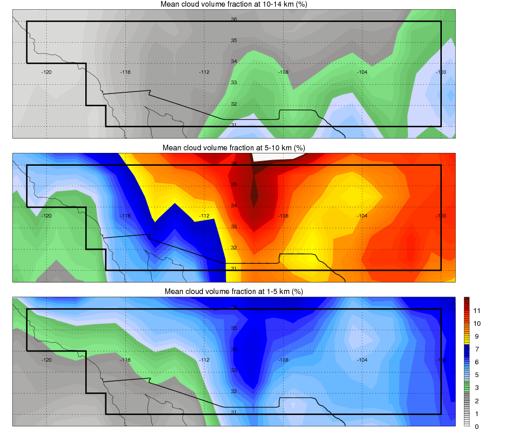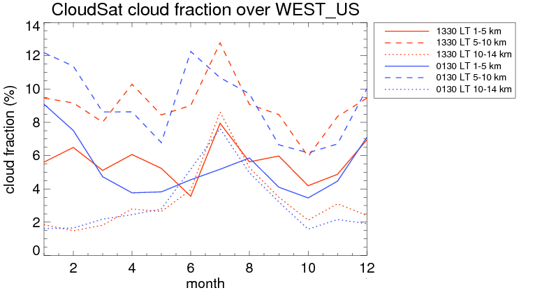 Over WEST_US , mean high level (10-14 km) cloud volume fraction is about 3.3%. Mean mid level (5-10 km) cloud volume fraction is about 9.0%. Mean low level (1-5 km) cloud volume fraction is about 5.5%. Seasonal and day vs. night variations of high, mid and low level cloud fraction over WEST_US are shown in following figure. You may check the details of cloud fraction in various seasons and at different local times. |