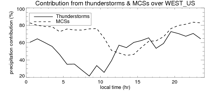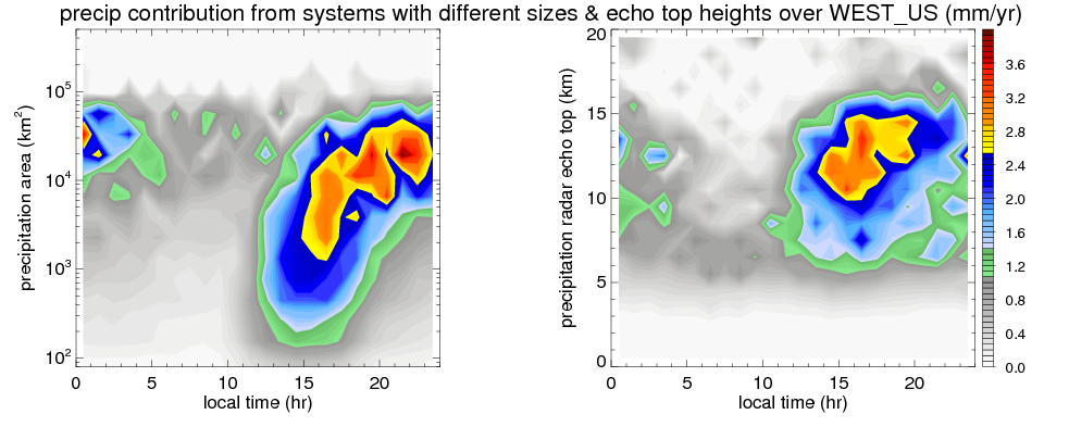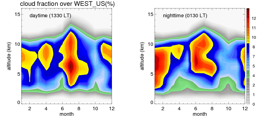 Many studies suggested that the diurnal variation of the precipitation is related to the life cycles of the precipitation systems, which is frequently driven by the surface sensible heating. Over WEST_US, mean annual precipitation are estimated with 357.1 (mm/year) from precipitation radar. Detailed diurnal variation of the precipitation at high resolution can be accessed here (NOTE: it may take long time to generate for a large area). The diurnal variation of precipitation from systems with different sizes and heights are shown below: In total, thunderstorms (systems with detected lightning flashes) contribute 58 %, MCSs (Mesoscale convective systems with raining area > 2000 km^2) contribute 68 % of all precipitation over WEST_US. Diurnal variations of fraction of precipitation from thunderstorms and MCSs over WEST_US are shown below: Certainly there is a strong diurnal variation of different types of clouds. Because CloudSat observes at 0130 and 1330 local time, here the daytime and night cloud fraction in different seasons are presented: |