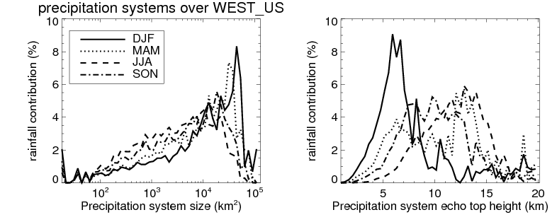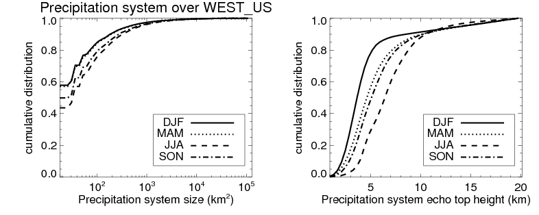 Over WEST_US , mean size of precipitation system about 267.0 (km^2) and mean maximum radar echo top height of these precipitation systems is about 6.3 km. Following figure shows the cumulative distribution of the sizes and depths of the precipitation systems in different seasons: Though usually there are more small systems, the larger systems would bring more total precipitation. |