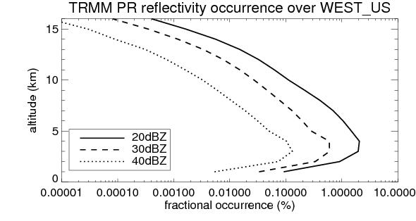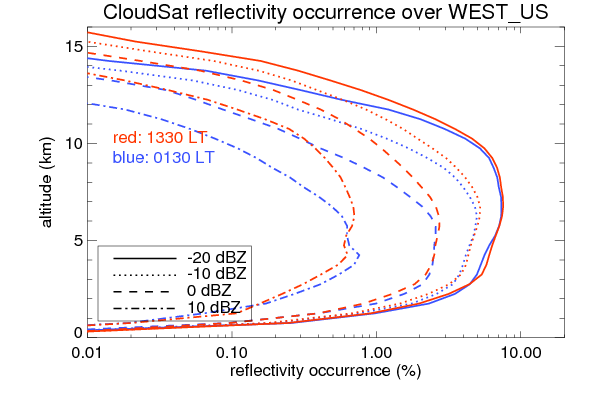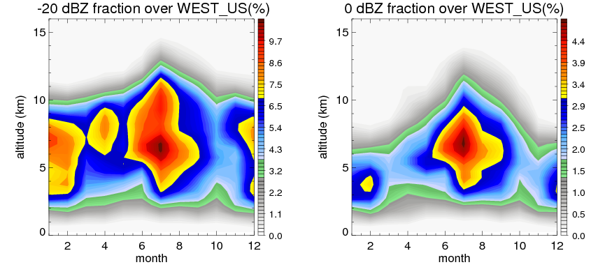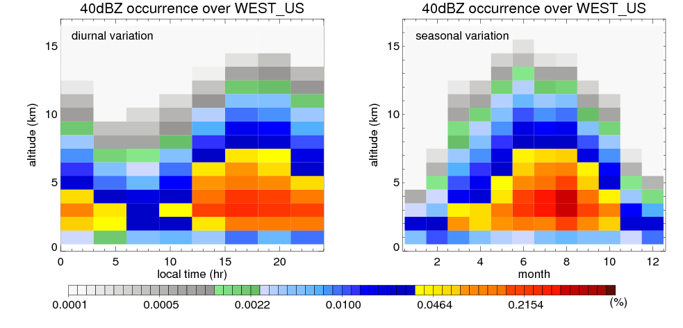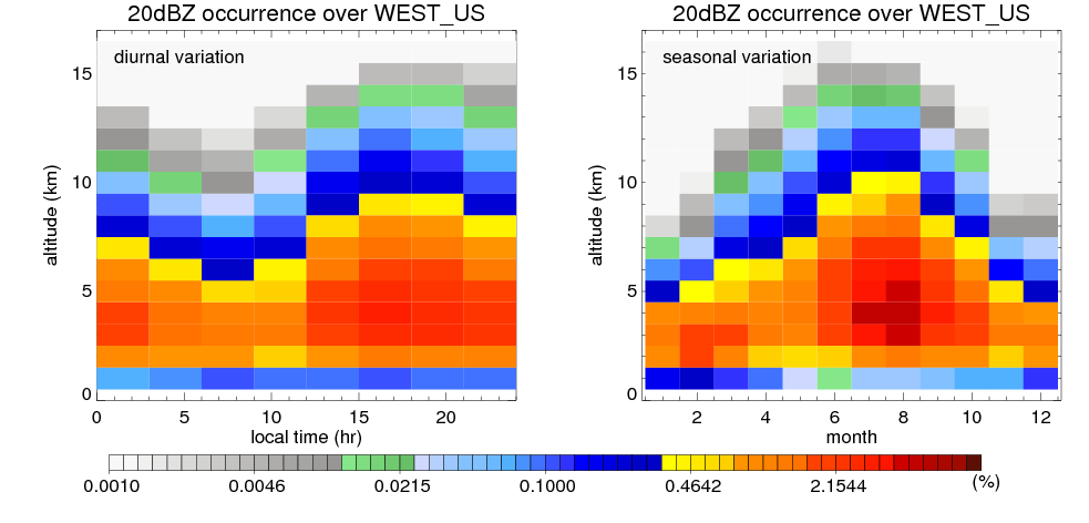 Here the precipitation means the precipitable hydrometeors (raindrops, snow flakes, graupel and hails) that detected by TRMM precipitation radar. Following figure shows the vertical profiles of 20, 30 and 40 dBZ fractional occurrence over WEST_US in different seasons. The seasonal and diurnal variations of precipitation (20 dBZ) fractional occurrence at different altitudes are shown below: The seasonal and diurnal variations of INTENSIVE precipitation (40 dBZ) fractional occurrence at different altitudes are shown below: Clouds are consisted of small hydrometeors that undetectable by TRMM precipitation radar (Ku band). CloudSat (W band radar) provides the much great details of clouds. Following figure shows the vertical structure of the thin and thick clouds over WEST_US. Note that high reflectivity at low levels are less frequent due to the attenuation. The seasonal variation of thin (-20 dBZ) and thick (0 dBZ) cloud over WEST_US are shown below: |