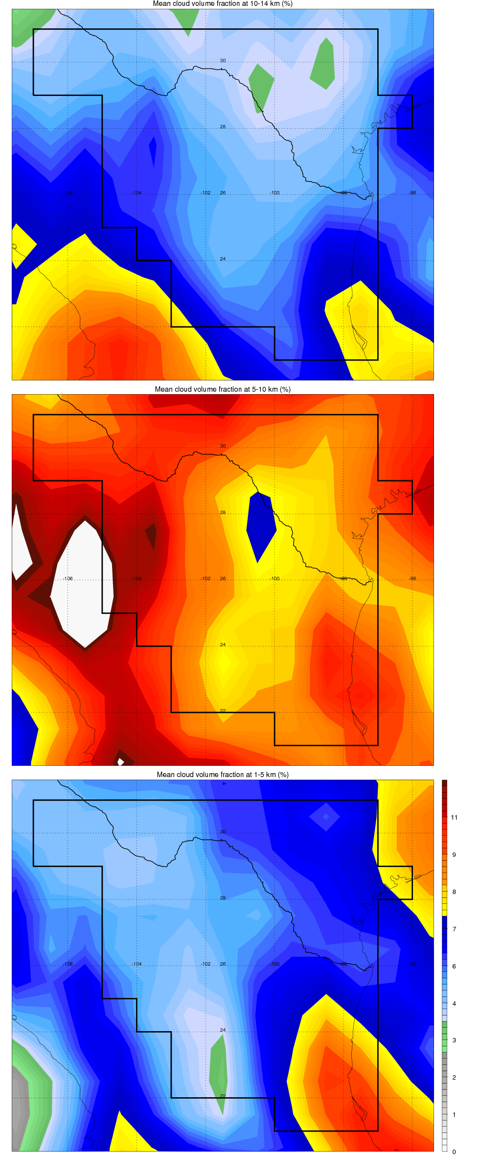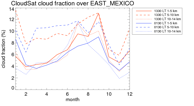 Over EAST_MEXICO , mean high level (10-14 km) cloud volume fraction is about 5.8%. Mean mid level (5-10 km) cloud volume fraction is about 9.6%. Mean low level (1-5 km) cloud volume fraction is about 6.4%. Seasonal and day vs. night variations of high, mid and low level cloud fraction over EAST_MEXICO are shown in following figure. You may check the details of cloud fraction in various seasons and at different local times. |