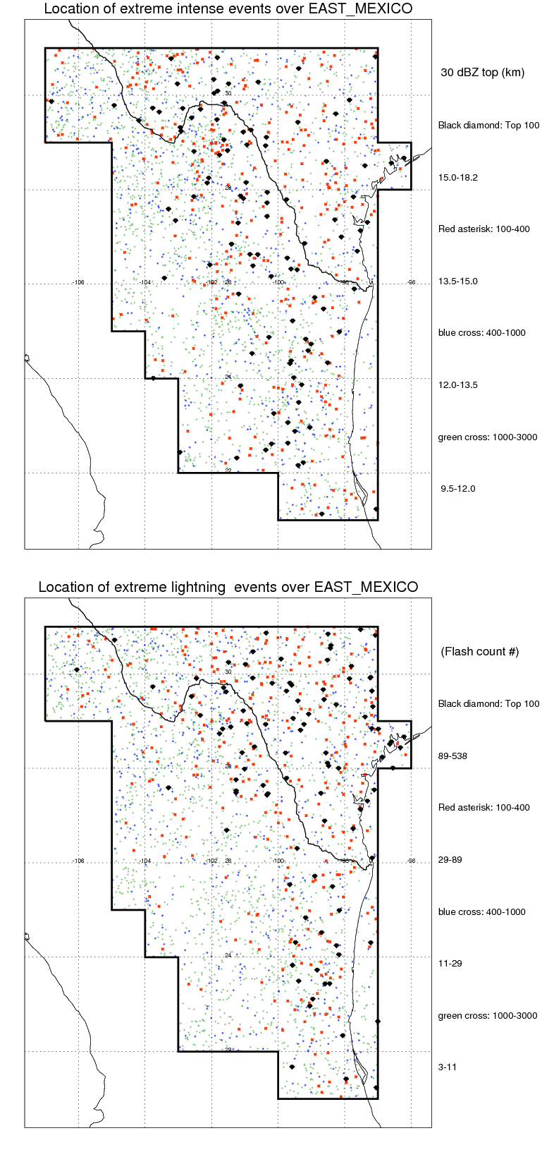 Following figure shows the location of the precipitation feautres categorized by the lightning rate and 30 dBZ echo top.