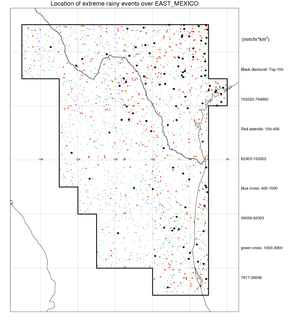 Following figure shows the location of the precipitation feautres categorized by the volumetric rainfall.