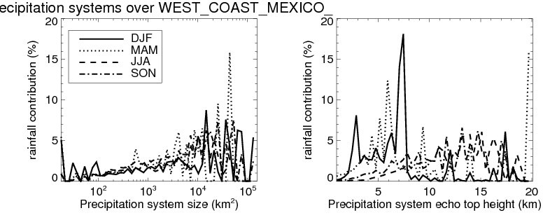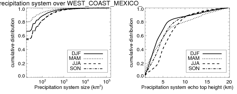 Over WEST_COAST_MEXICO_ , mean size of precipitation system about 220.0 (km^2) and mean maximum radar echo top height of these precipitation systems is about 6.1 km. Following figure shows the cumulative distribution of the sizes and depths of the precipitation systems in different seasons: Though usually there are more small systems, the larger systems would bring more total precipitation. |