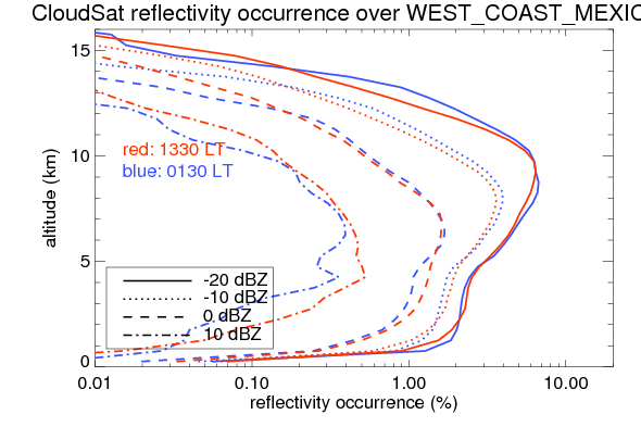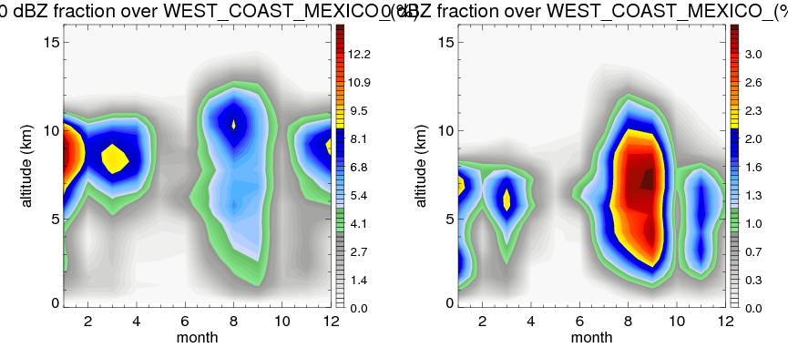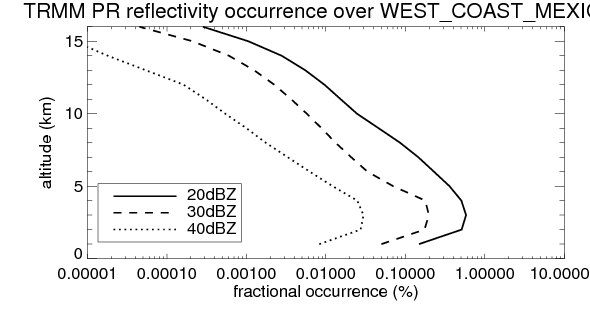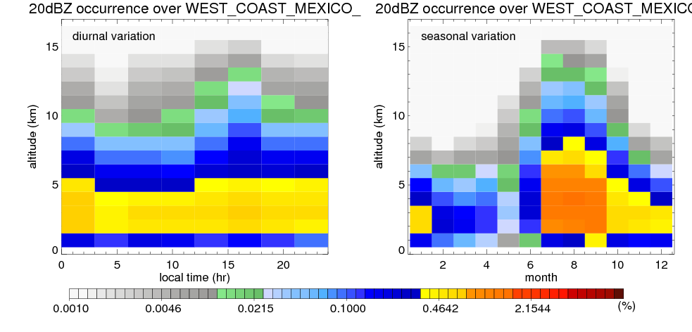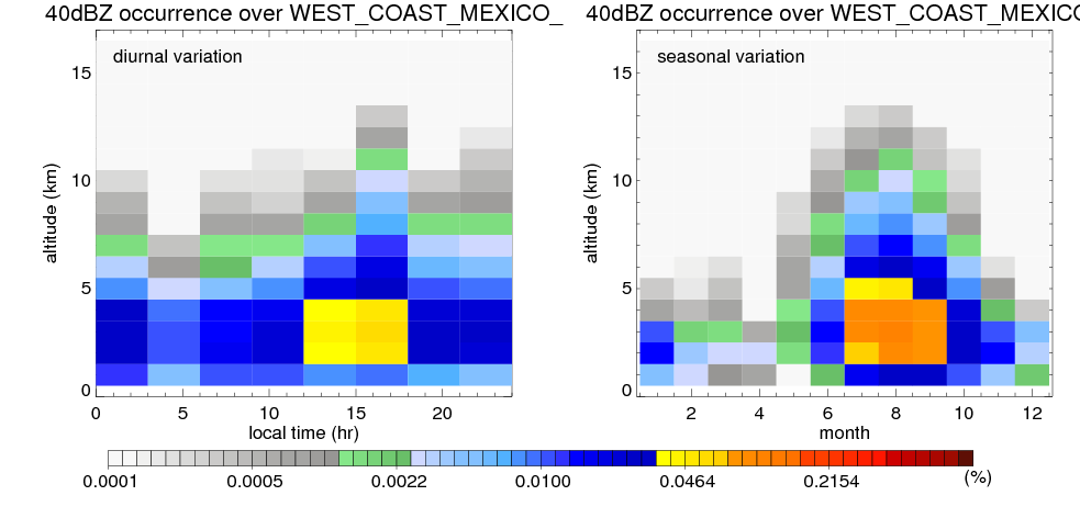 Here the precipitation means the precipitable hydrometeors (raindrops, snow flakes, graupel and hails) that detected by TRMM precipitation radar. Following figure shows the vertical profiles of 20, 30 and 40 dBZ fractional occurrence over WEST_COAST_MEXICO_ in different seasons. The seasonal and diurnal variations of precipitation (20 dBZ) fractional occurrence at different altitudes are shown below: The seasonal and diurnal variations of INTENSIVE precipitation (40 dBZ) fractional occurrence at different altitudes are shown below: Clouds are consisted of small hydrometeors that undetectable by TRMM precipitation radar (Ku band). CloudSat (W band radar) provides the much great details of clouds. Following figure shows the vertical structure of the thin and thick clouds over WEST_COAST_MEXICO_. Note that high reflectivity at low levels are less frequent due to the attenuation. The seasonal variation of thin (-20 dBZ) and thick (0 dBZ) cloud over WEST_COAST_MEXICO_ are shown below: |