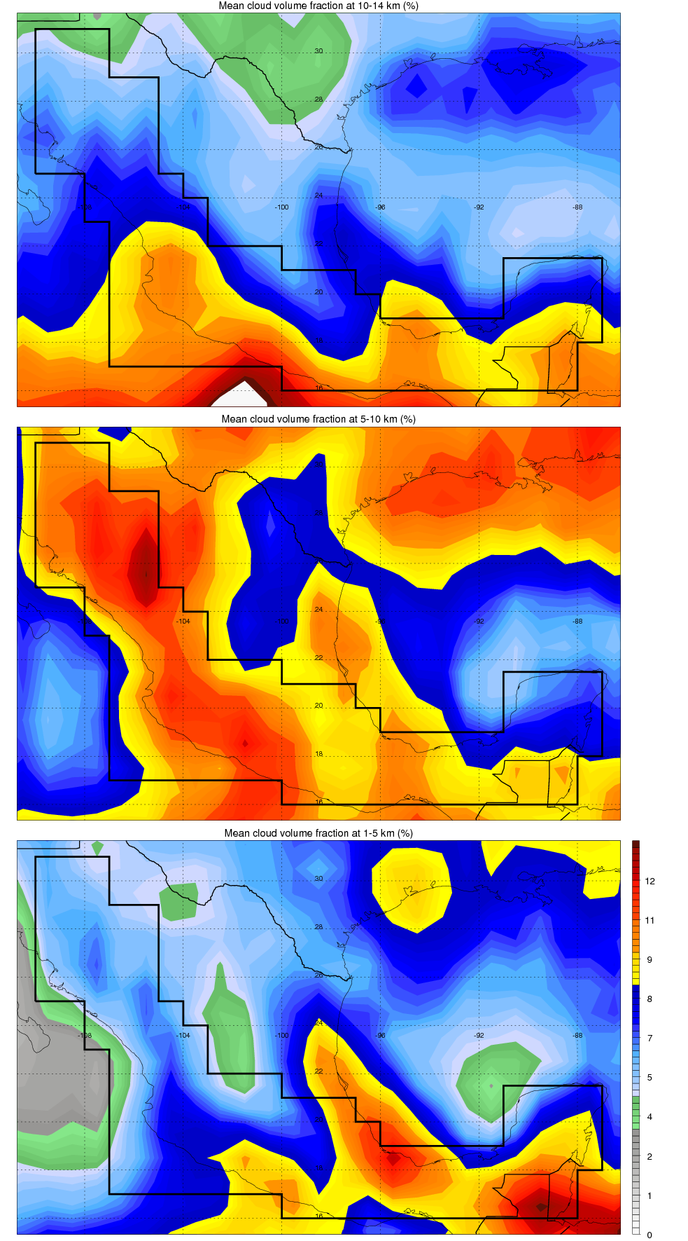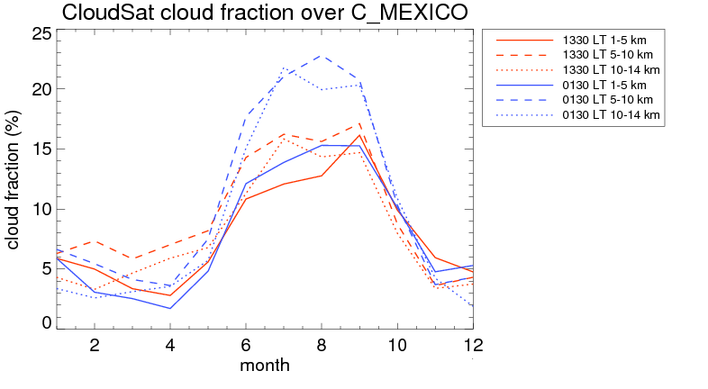 Over C_MEXICO , mean high level (10-14 km) cloud volume fraction is about 8.9%. Mean mid level (5-10 km) cloud volume fraction is about 10.3%. Mean low level (1-5 km) cloud volume fraction is about 8.1%. Seasonal and day vs. night variations of high, mid and low level cloud fraction over C_MEXICO are shown in following figure. You may check the details of cloud fraction in various seasons and at different local times. |