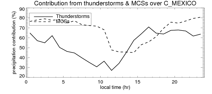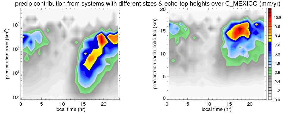 Many studies suggested that the diurnal variation of the precipitation is related to the life cycles of the precipitation systems, which is frequently driven by the surface sensible heating. Over C_MEXICO, mean annual precipitation are estimated with 1000.7 (mm/year) from precipitation radar. Detailed diurnal variation of the precipitation at high resolution can be accessed here (NOTE: it may take long time to generate for a large area). The diurnal variation of precipitation from systems with different sizes and heights are shown below: In total, thunderstorms (systems with detected lightning flashes) contribute 58 %, MCSs (Mesoscale convective systems with raining area > 2000 km^2) contribute 67 % of all precipitation over C_MEXICO. Diurnal variations of fraction of precipitation from thunderstorms and MCSs over C_MEXICO are shown below: Certainly there is a strong diurnal variation of different types of clouds. Because CloudSat observes at 0130 and 1330 local time, here the daytime and night cloud fraction in different seasons are presented: |