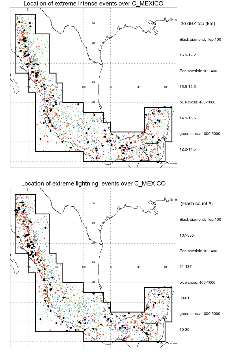 Following figure shows the location of the precipitation feautres categorized by the lightning rate and 30 dBZ echo top.
