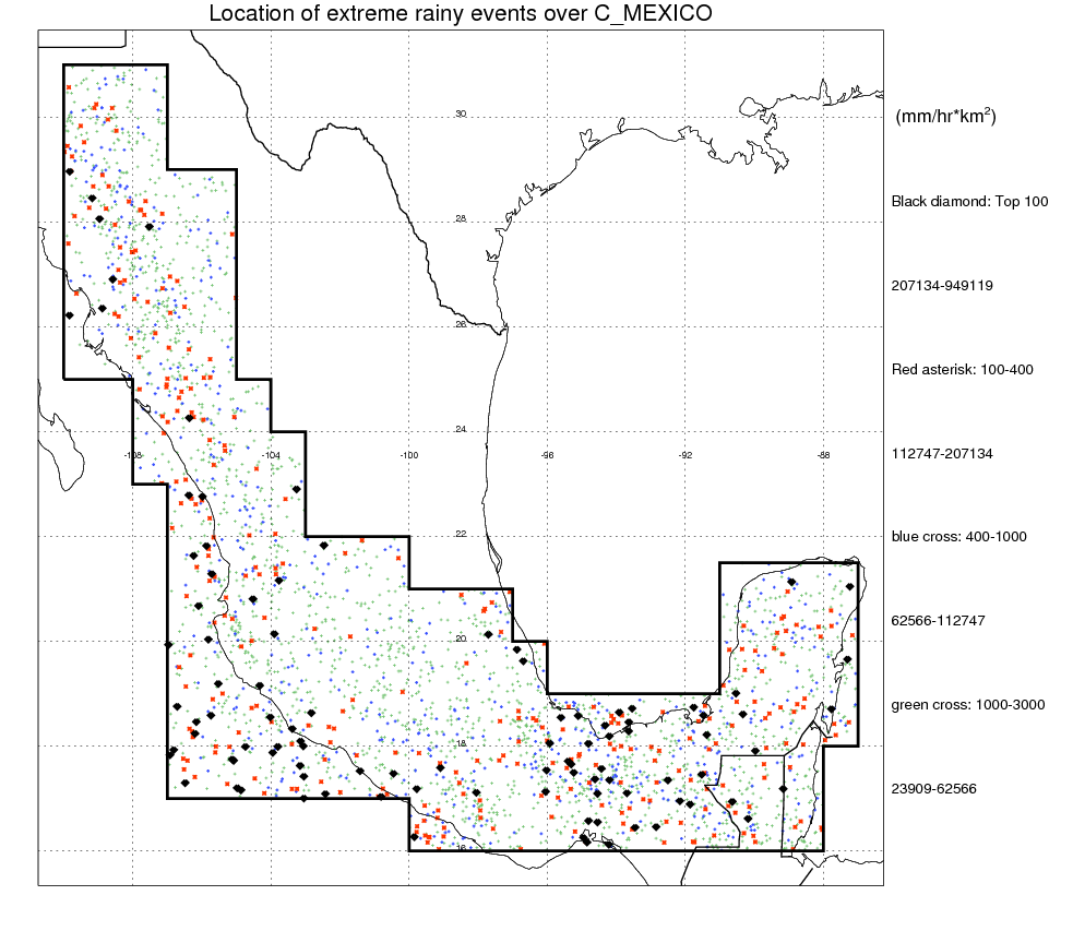 Following figure shows the location of the precipitation feautres categorized by the volumetric rainfall.
