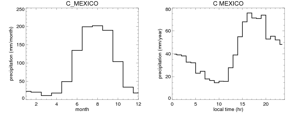 Over C_MEXICO , mean annual precipitation are estimated with 1000.7 (mm/year) from precipitation radar, and 999.9 (mm/year) from microwave radiometer observations. (see high resolution precipitation product , NOTE: it may take long time to generate for large area) In total, thunderstorms (systems with detected lightning flashes) contribute 58 %, MCSs (Mesoscale convective systems with raining area > 2000 km^2) contribute 67 % of all precipitation. Seasonal and diurnal variations of rainfall over C_MEXICO are shown in following figure. You may check the details of rainfall contributions from precipitation systems with different sizes and intensities in various seasons and at different local times. |