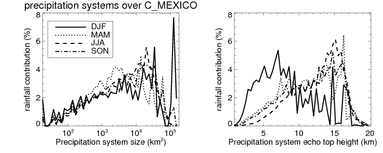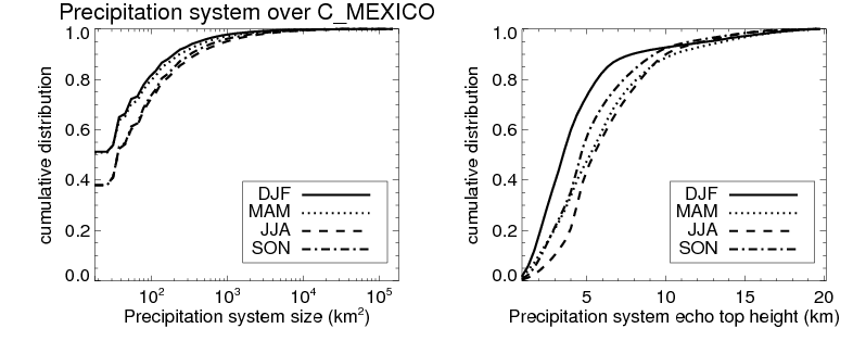 Over C_MEXICO , mean size of precipitation system about 327.8 (km^2) and mean maximum radar echo top height of these precipitation systems is about 6.0 km. Following figure shows the cumulative distribution of the sizes and depths of the precipitation systems in different seasons: Though usually there are more small systems, the larger systems would bring more total precipitation. |
