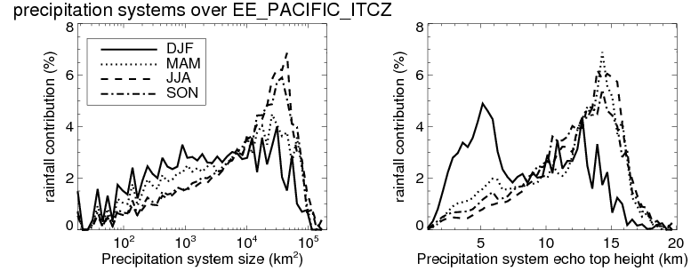 Over EE_PACIFIC_ITCZ , mean size of precipitation system about 321.3 (km^2) and mean maximum radar echo top height of these precipitation systems is about 4.4 km. Following figure shows the cumulative distribution of the sizes and depths of the precipitation systems in different seasons: Though usually there are more small systems, the larger systems would bring more total precipitation. |