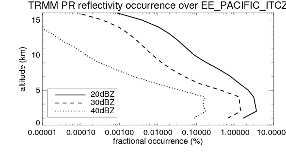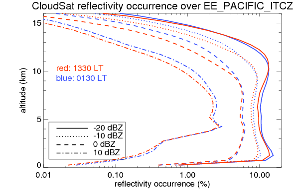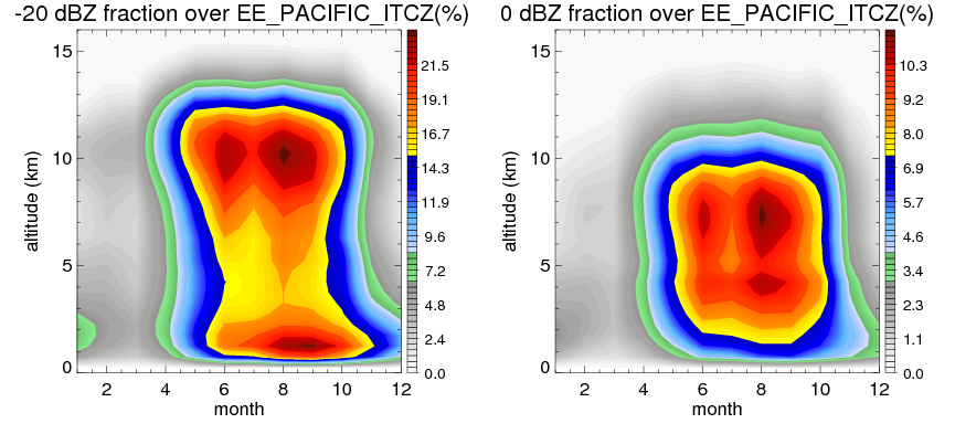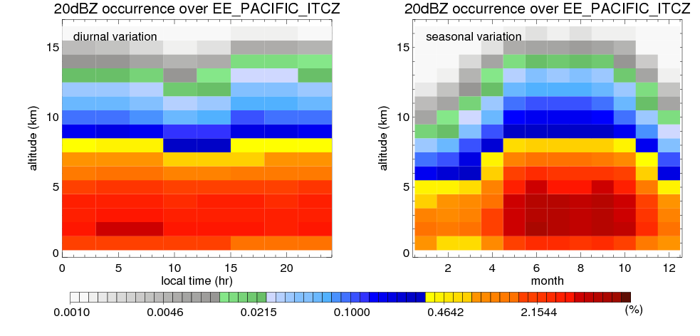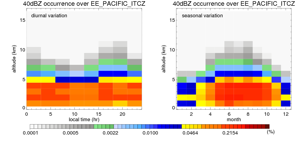 Here the precipitation means the precipitable hydrometeors (raindrops, snow flakes, graupel and hails) that detected by TRMM precipitation radar. Following figure shows the vertical profiles of 20, 30 and 40 dBZ fractional occurrence over EE_PACIFIC_ITCZ in different seasons. The seasonal and diurnal variations of precipitation (20 dBZ) fractional occurrence at different altitudes are shown below: The seasonal and diurnal variations of INTENSIVE precipitation (40 dBZ) fractional occurrence at different altitudes are shown below: Clouds are consisted of small hydrometeors that undetectable by TRMM precipitation radar (Ku band). CloudSat (W band radar) provides the much great details of clouds. Following figure shows the vertical structure of the thin and thick clouds over EE_PACIFIC_ITCZ. Note that high reflectivity at low levels are less frequent due to the attenuation. The seasonal variation of thin (-20 dBZ) and thick (0 dBZ) cloud over EE_PACIFIC_ITCZ are shown below: |