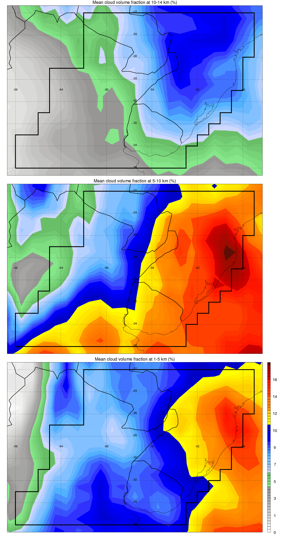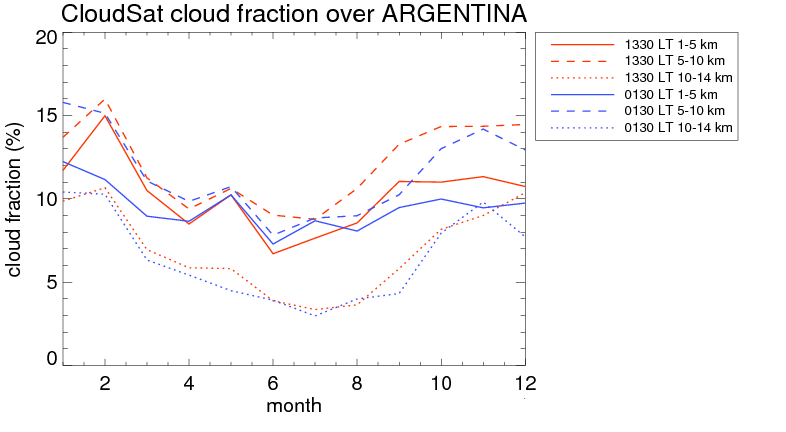 Over ARGENTINA , mean high level (10-14 km) cloud volume fraction is about 6.7%. Mean mid level (5-10 km) cloud volume fraction is about 11.9%. Mean low level (1-5 km) cloud volume fraction is about 9.9%. Seasonal and day vs. night variations of high, mid and low level cloud fraction over ARGENTINA are shown in following figure. You may check the details of cloud fraction in various seasons and at different local times. |