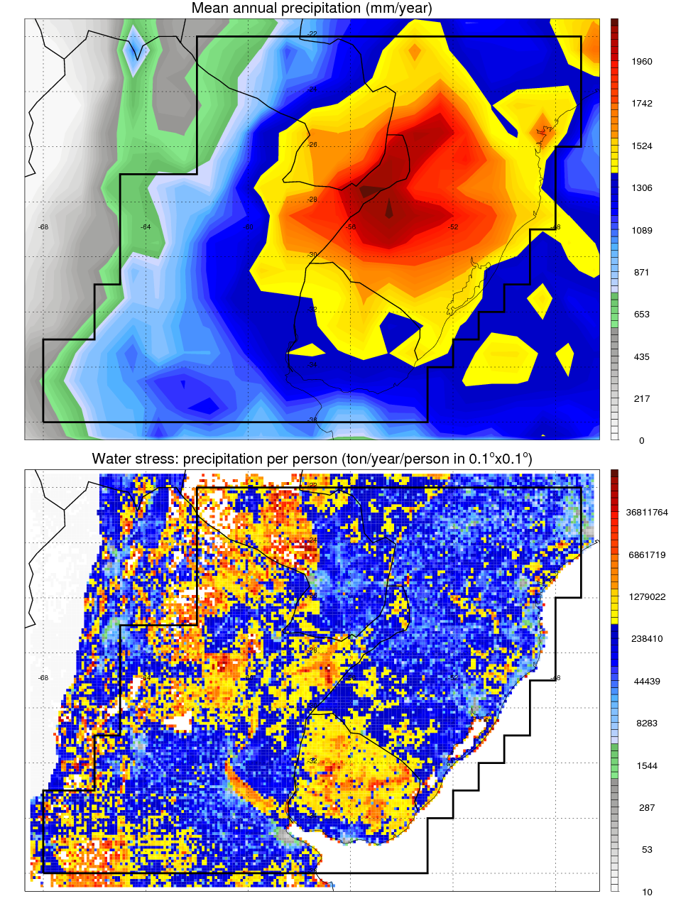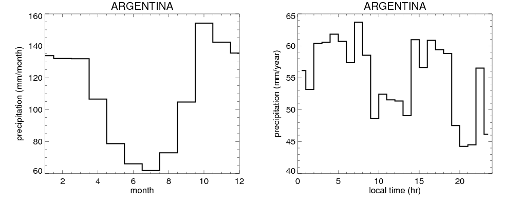 Over ARGENTINA , mean annual precipitation are estimated with 1320.8 (mm/year) from precipitation radar, and 1229.7 (mm/year) from microwave radiometer observations. (see high resolution precipitation product , NOTE: it may take long time to generate for large area) In total, thunderstorms (systems with detected lightning flashes) contribute 76 %, MCSs (Mesoscale convective systems with raining area > 2000 km^2) contribute 88 % of all precipitation. Seasonal and diurnal variations of rainfall over ARGENTINA are shown in following figure. You may check the details of rainfall contributions from precipitation systems with different sizes and intensities in various seasons and at different local times. |