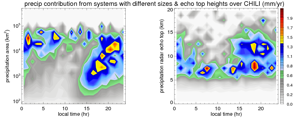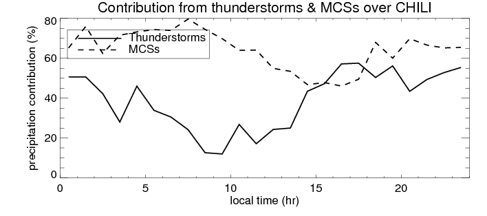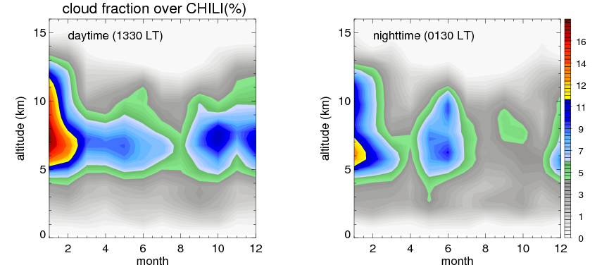 Many studies suggested that the diurnal variation of the precipitation is related to the life cycles of the precipitation systems, which is frequently driven by the surface sensible heating. Over CHILI, mean annual precipitation are estimated with 213.3 (mm/year) from precipitation radar. Detailed diurnal variation of the precipitation at high resolution can be accessed here (NOTE: it may take long time to generate for a large area). The diurnal variation of precipitation from systems with different sizes and heights are shown below: In total, thunderstorms (systems with detected lightning flashes) contribute 42 %, MCSs (Mesoscale convective systems with raining area > 2000 km^2) contribute 63 % of all precipitation over CHILI. Diurnal variations of fraction of precipitation from thunderstorms and MCSs over CHILI are shown below: Certainly there is a strong diurnal variation of different types of clouds. Because CloudSat observes at 0130 and 1330 local time, here the daytime and night cloud fraction in different seasons are presented: |