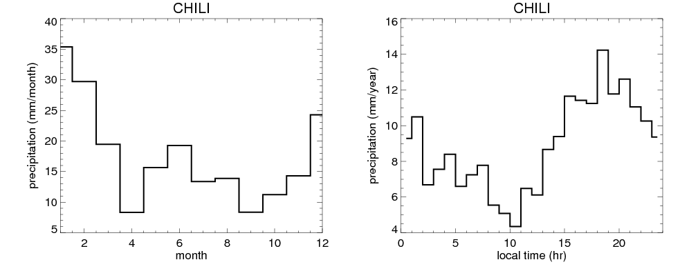 Over CHILI , mean annual precipitation are estimated with 213.3 (mm/year) from precipitation radar, and 476.1 (mm/year) from microwave radiometer observations. (see high resolution precipitation product , NOTE: it may take long time to generate for large area) In total, thunderstorms (systems with detected lightning flashes) contribute 42 %, MCSs (Mesoscale convective systems with raining area > 2000 km^2) contribute 63 % of all precipitation. Seasonal and diurnal variations of rainfall over CHILI are shown in following figure. You may check the details of rainfall contributions from precipitation systems with different sizes and intensities in various seasons and at different local times. |