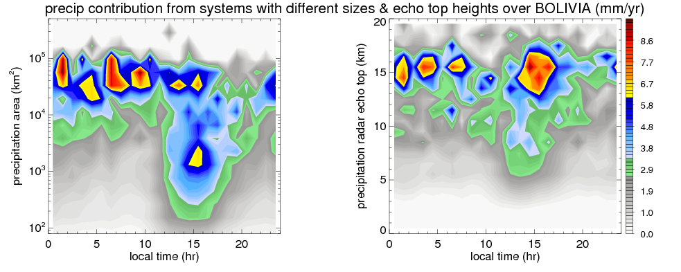 Many studies suggested that the diurnal variation of the precipitation is related to the life cycles of the precipitation systems, which is frequently driven by the surface sensible heating. Over BOLIVIA, mean annual precipitation are estimated with 961.2 (mm/year) from precipitation radar. Detailed diurnal variation of the precipitation at high resolution can be accessed here (NOTE: it may take long time to generate for a large area). The diurnal variation of precipitation from systems with different sizes and heights are shown below: In total, thunderstorms (systems with detected lightning flashes) contribute 60 %, MCSs (Mesoscale convective systems with raining area > 2000 km^2) contribute 71 % of all precipitation over BOLIVIA. Diurnal variations of fraction of precipitation from thunderstorms and MCSs over BOLIVIA are shown below: Certainly there is a strong diurnal variation of different types of clouds. Because CloudSat observes at 0130 and 1330 local time, here the daytime and night cloud fraction in different seasons are presented: |