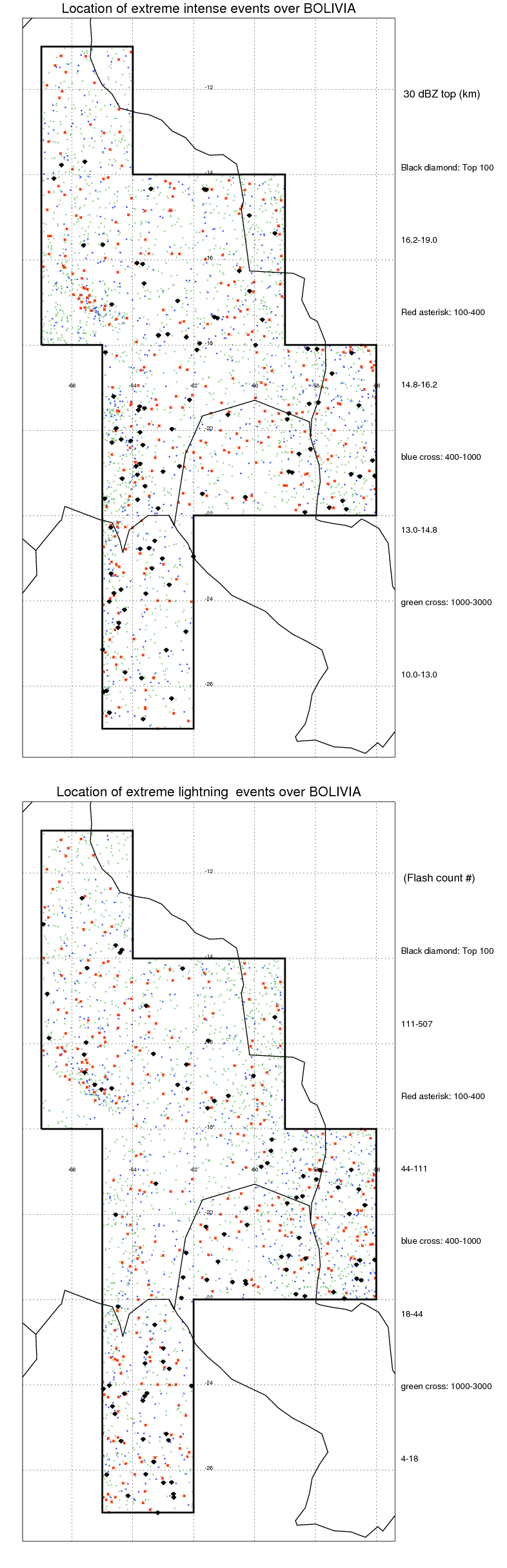 Following figure shows the location of the precipitation feautres categorized by the lightning rate and 30 dBZ echo top.