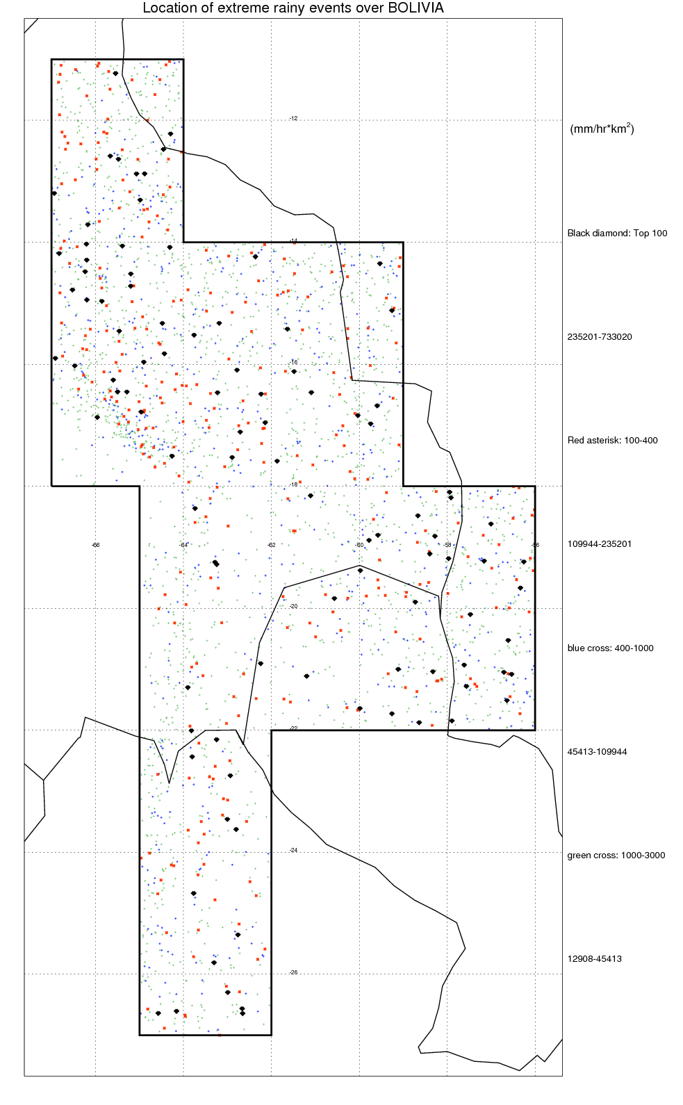 Following figure shows the location of the precipitation feautres categorized by the volumetric rainfall.