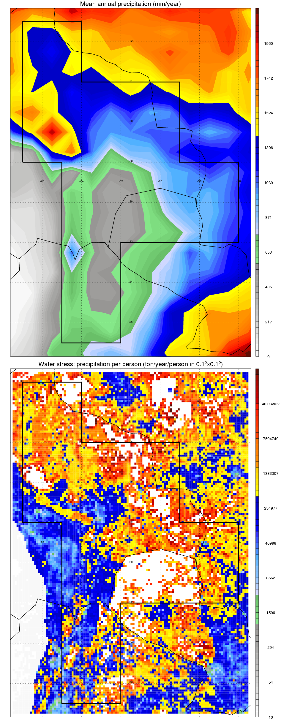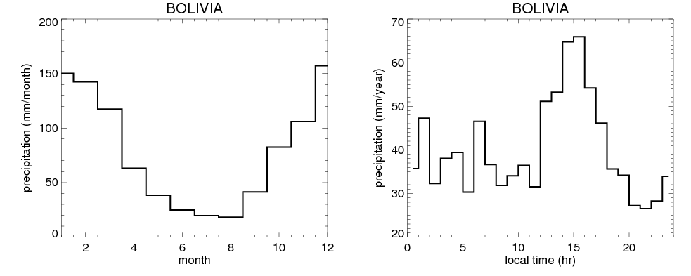 Over BOLIVIA , mean annual precipitation are estimated with 961.2 (mm/year) from precipitation radar, and 1042.8 (mm/year) from microwave radiometer observations. (see high resolution precipitation product , NOTE: it may take long time to generate for large area) In total, thunderstorms (systems with detected lightning flashes) contribute 60 %, MCSs (Mesoscale convective systems with raining area > 2000 km^2) contribute 71 % of all precipitation. Seasonal and diurnal variations of rainfall over BOLIVIA are shown in following figure. You may check the details of rainfall contributions from precipitation systems with different sizes and intensities in various seasons and at different local times. |