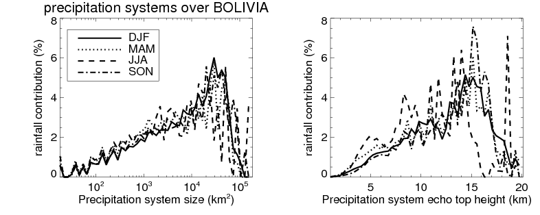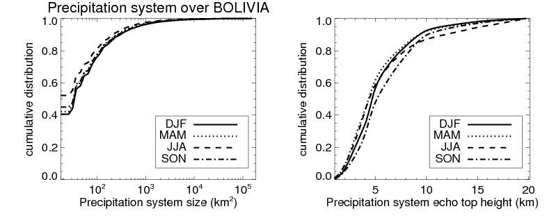 Over BOLIVIA , mean size of precipitation system about 304.7 (km^2) and mean maximum radar echo top height of these precipitation systems is about 5.9 km. Following figure shows the cumulative distribution of the sizes and depths of the precipitation systems in different seasons: Though usually there are more small systems, the larger systems would bring more total precipitation. |