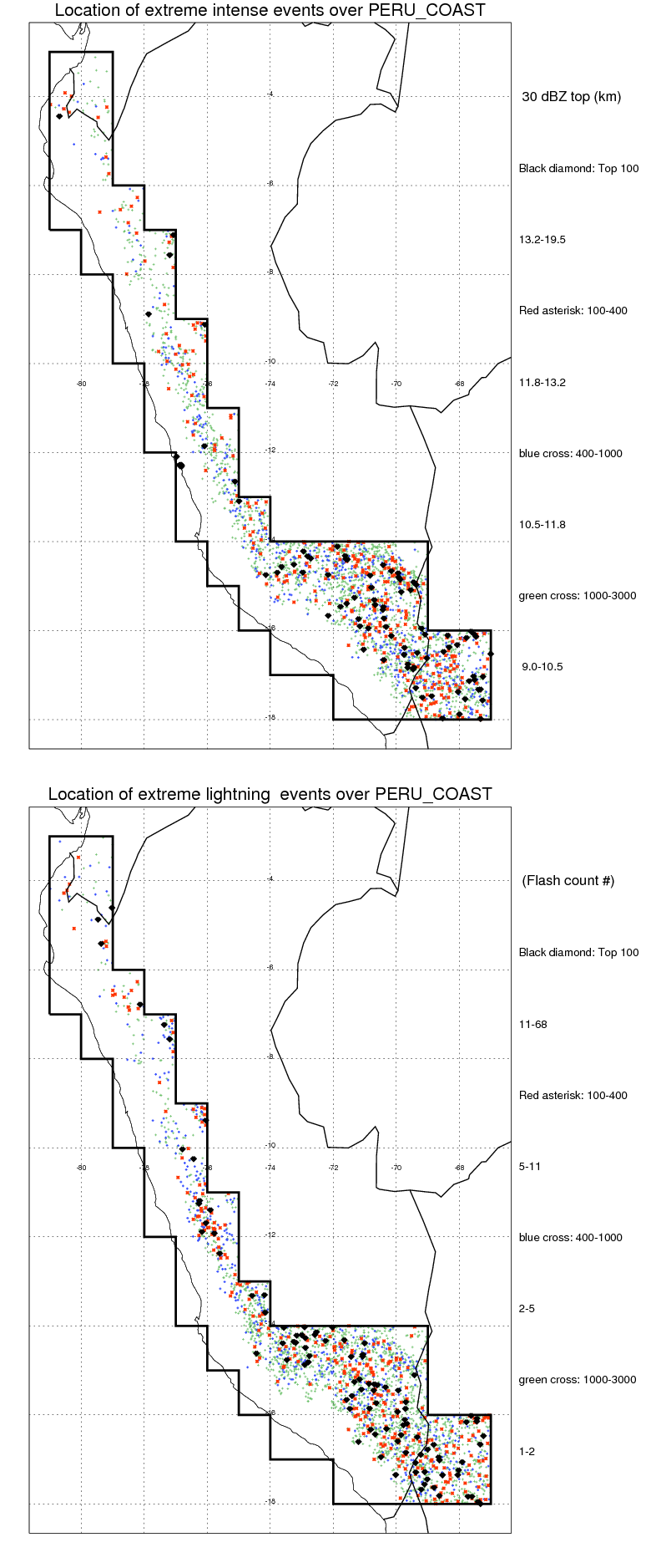 Following figure shows the location of the precipitation feautres categorized by the lightning rate and 30 dBZ echo top.
