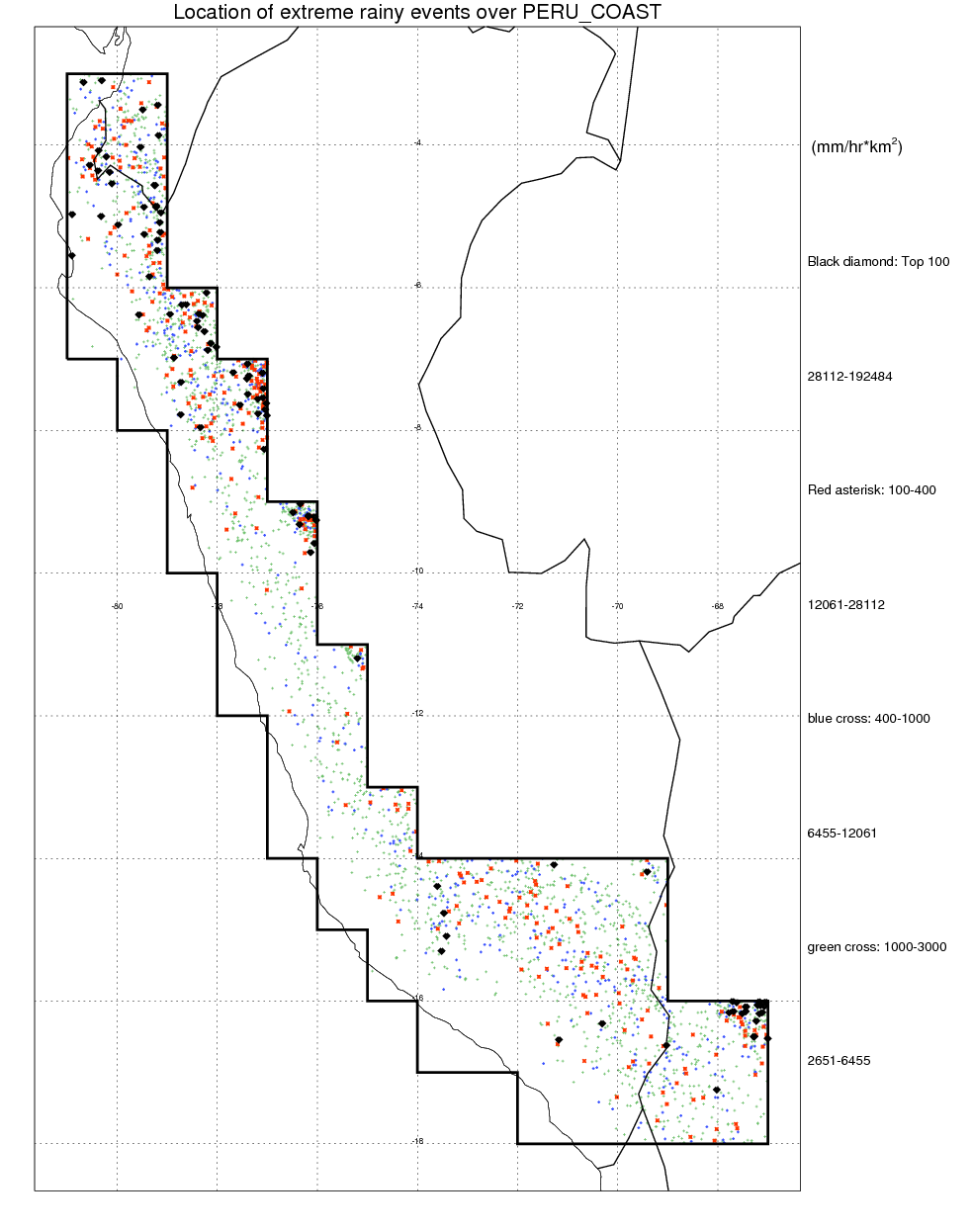 Following figure shows the location of the precipitation feautres categorized by the volumetric rainfall.