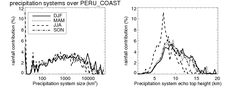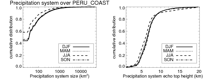 Over PERU_COAST , mean size of precipitation system about 154.3 (km^2) and mean maximum radar echo top height of these precipitation systems is about 7.1 km. Following figure shows the cumulative distribution of the sizes and depths of the precipitation systems in different seasons: Though usually there are more small systems, the larger systems would bring more total precipitation. |