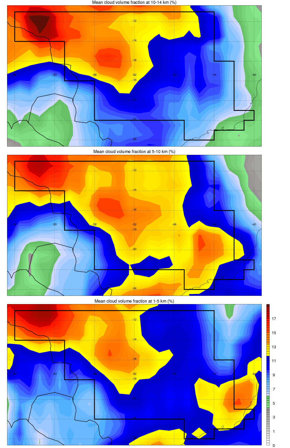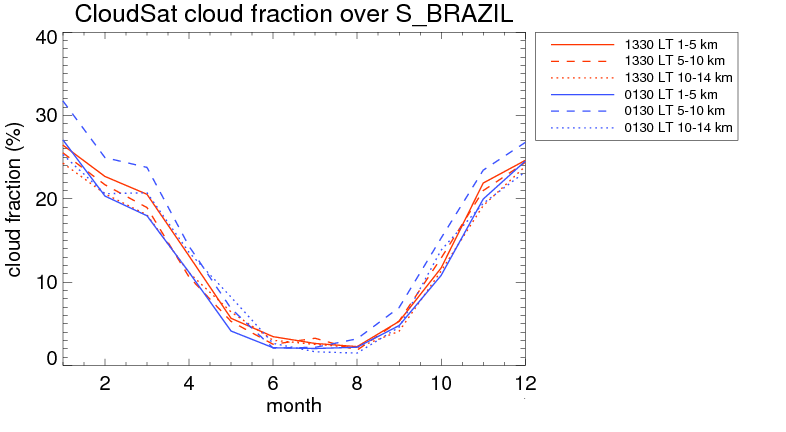 Over S_BRAZIL , mean high level (10-14 km) cloud volume fraction is about 12.2%. Mean mid level (5-10 km) cloud volume fraction is about 13.3%. Mean low level (1-5 km) cloud volume fraction is about 12.6%. Seasonal and day vs. night variations of high, mid and low level cloud fraction over S_BRAZIL are shown in following figure. You may check the details of cloud fraction in various seasons and at different local times. |